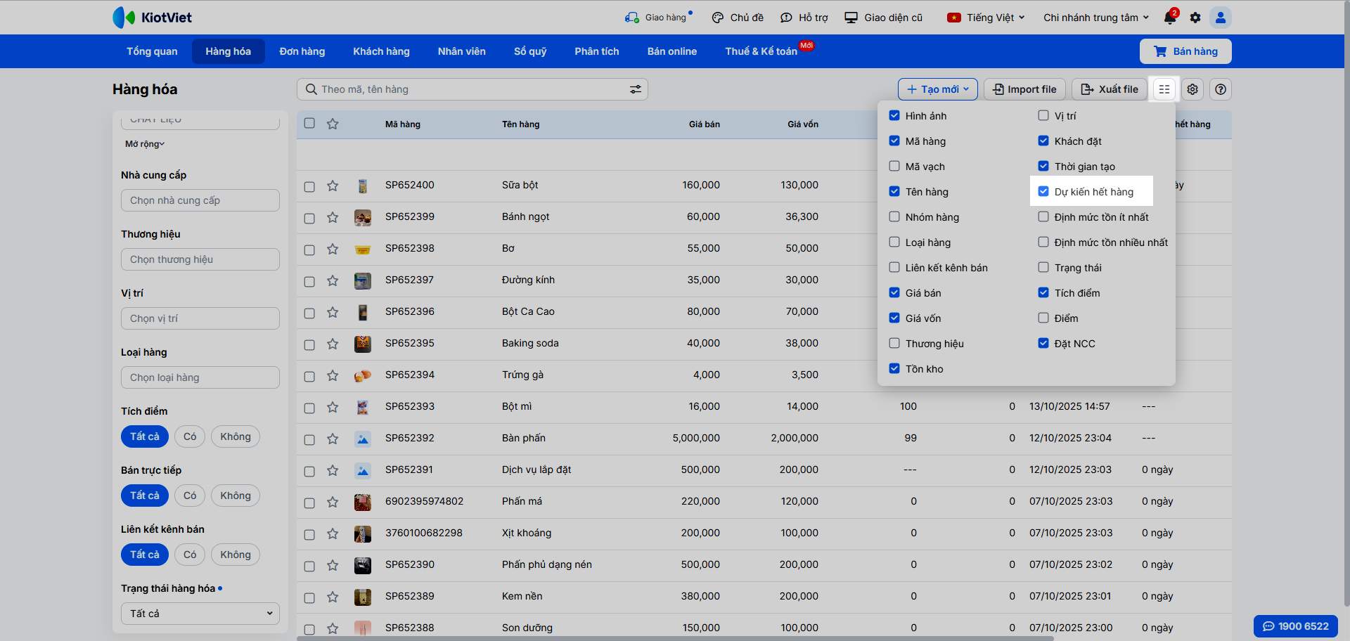 - Hệ thống sẽ hiển thị danh sách các sản phẩm gợi ý từ dữ liệu mẫu của KiotViet.