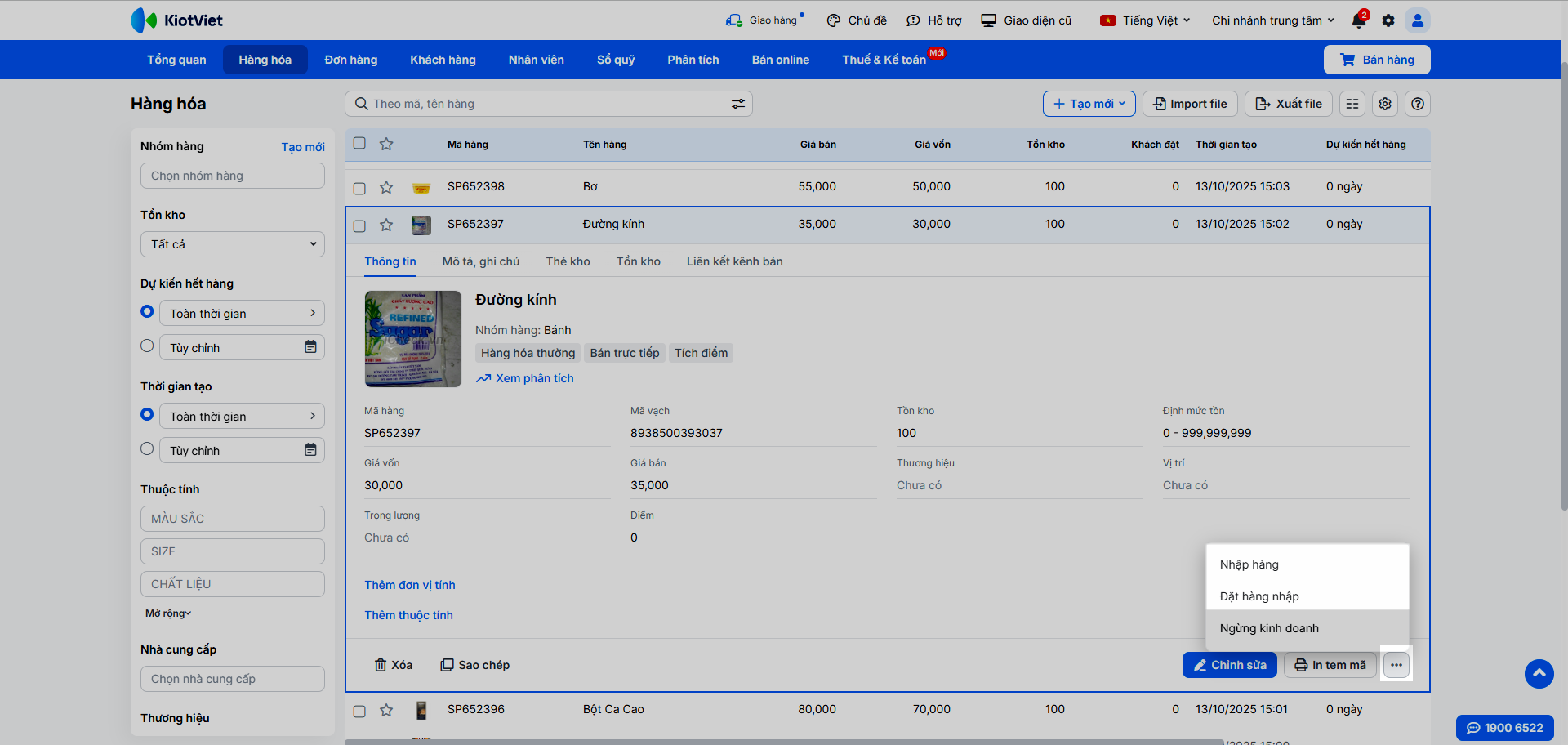 - Thao tác thực hiện như sau: Trong màn hình chi tiết hàng hóa, chạm vào biểu tượng ba chấm (…) để truy cập các tùy chọn Ngừng kinh doanh, Xóa, hoặc In tem mã.