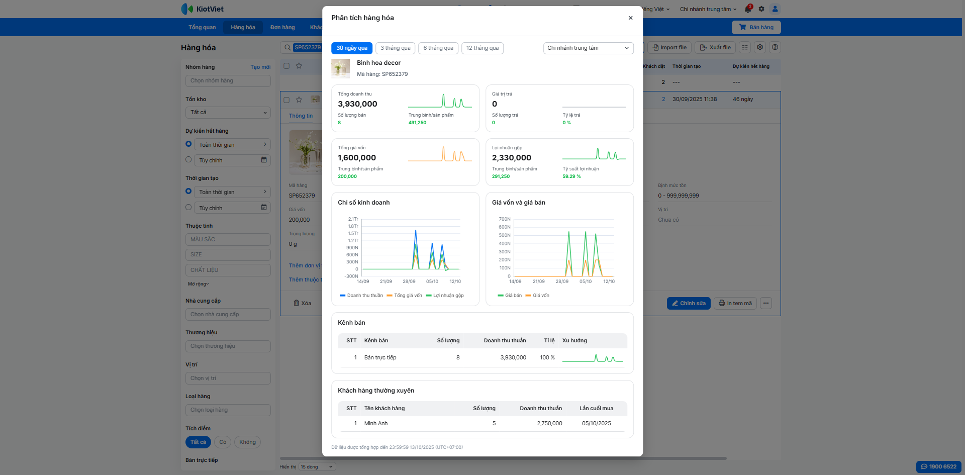 - Thao tác thực hiện như sau: Trong chi tiết hàng hóa, chạm vào Xem phân tích. Hệ thống sẽ hiển thị các biểu đồ về doanh thu, lợi nhuận, số lượng bán và danh sách khách hàng thường xuyên mua sản phẩm này.