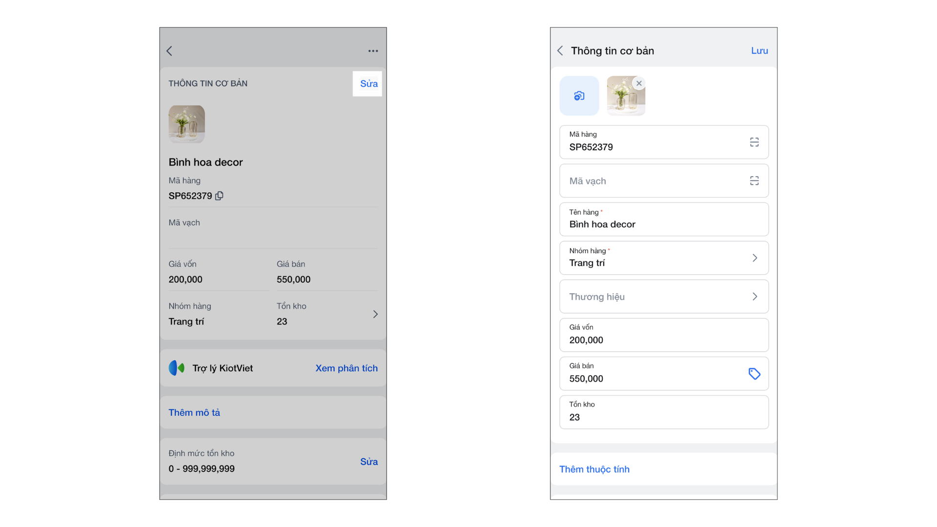- Chỉnh sửa: Chạm vào hàng hóa cần sửa, tại mỗi khu vực thông tin, chạm vào Sửa, cập nhật lại và Lưu.