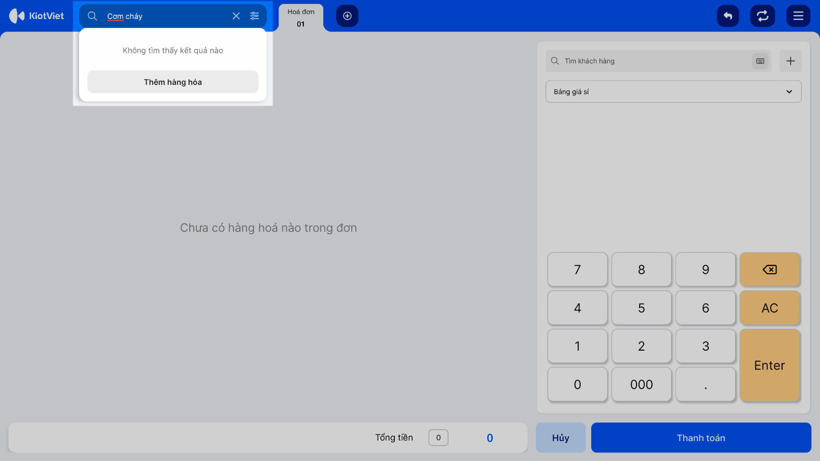 - Tại ô tìm kiếm, sau khi nhập một tên chưa có trong hệ thống, nhấn chọn Thêm hàng hóa.