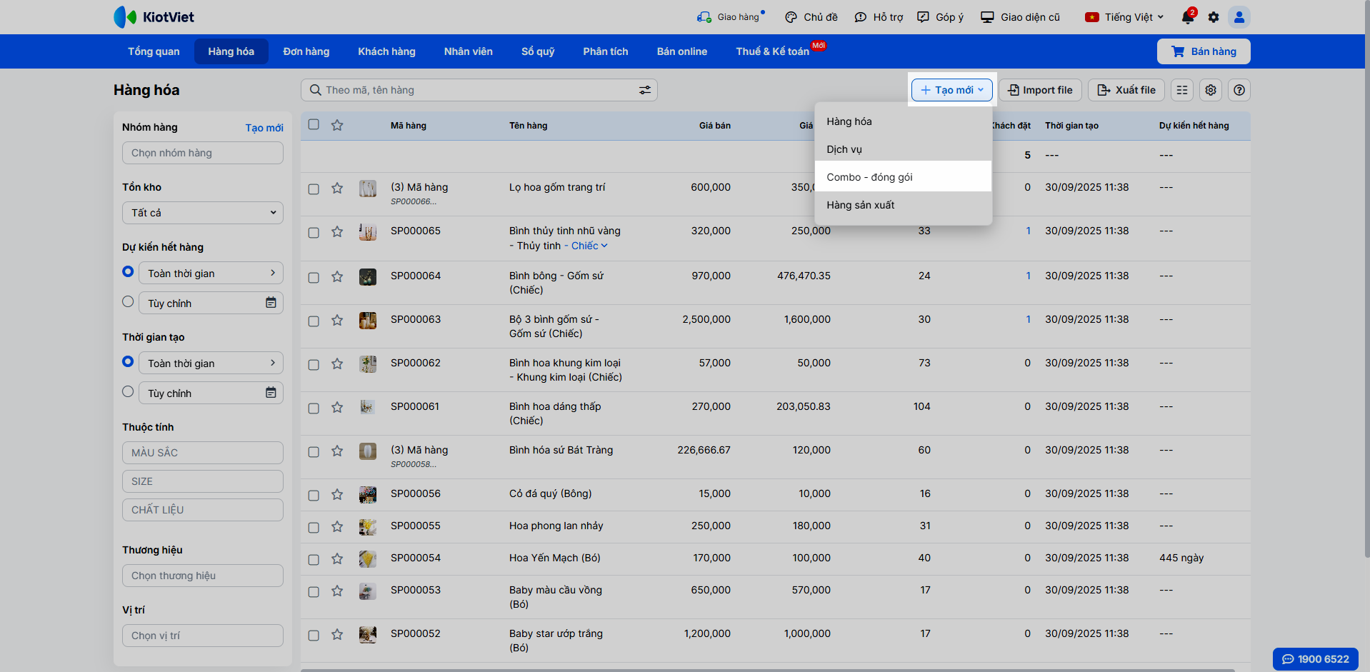 - Tại màn hình Hàng hóa → Danh sách hàng hóa, bạn nhấn Tạo mới → Combo – đóng gói.