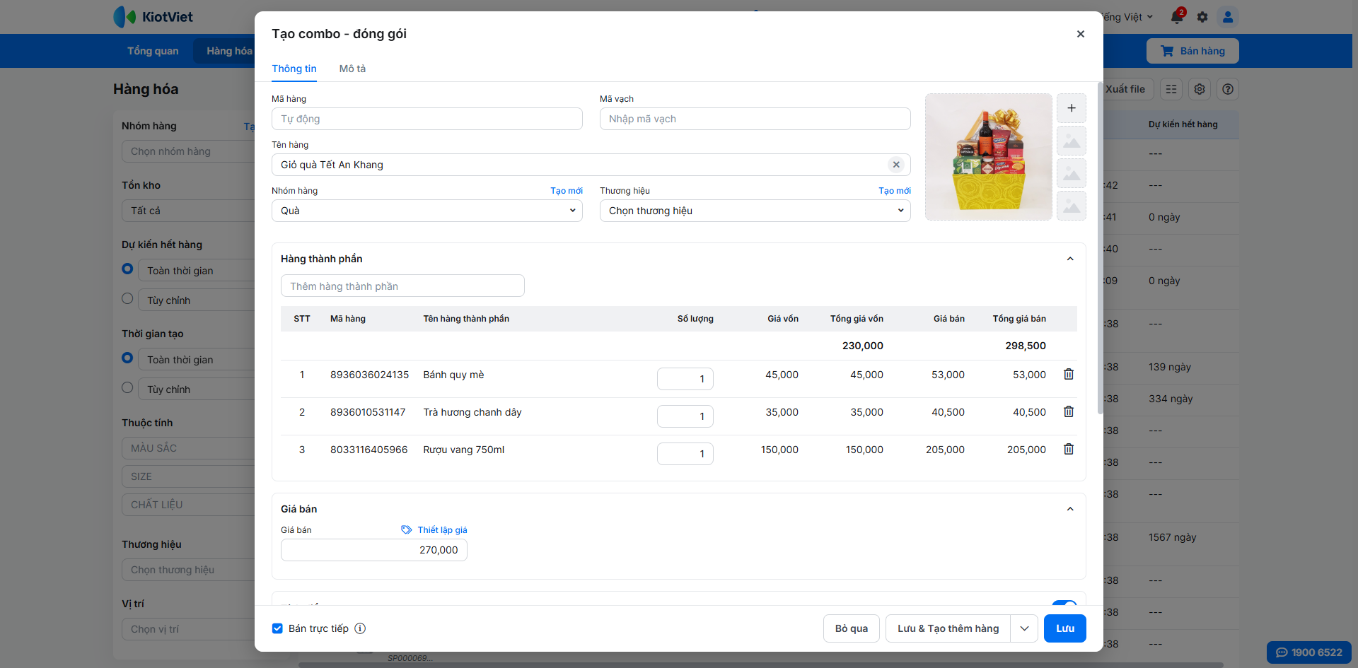 - Tình huống: Cửa hàng của bạn muốn tạo một sản phẩm “Giỏ quà Tết” bằng cách đóng gói các mặt hàng có sẵn như trà, rượu và bánh kẹo để bán trong dịp lễ.