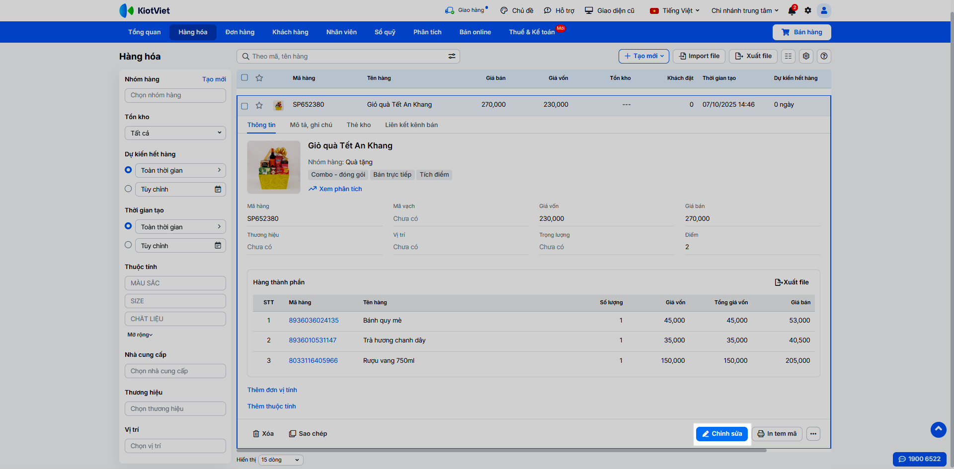 - Để chỉnh sửa: Vào Hàng hóa → Danh sách hàng hóa, tìm đến hàng combo – đóng gói cần sửa và nhấn Chỉnh sửa → thay đổi thông tin và nhấn Lưu.