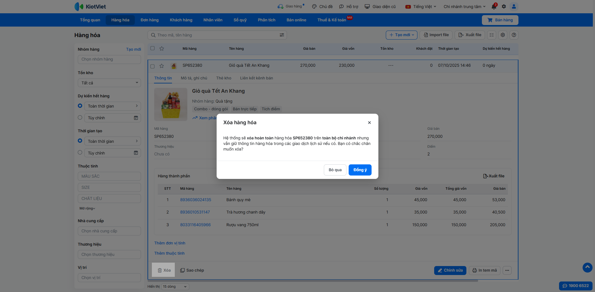 - Hệ thống sẽ xóa hoàn toàn hàng hóa trên toàn bộ chi nhánh nhưng vẫn giữ thông tin hàng hóa trong các giao dịch lịch sử nếu có. Khi xem lại các giao dịch, hàng hóa đã xóa sẽ có thêm hậu tố {DEL}.
