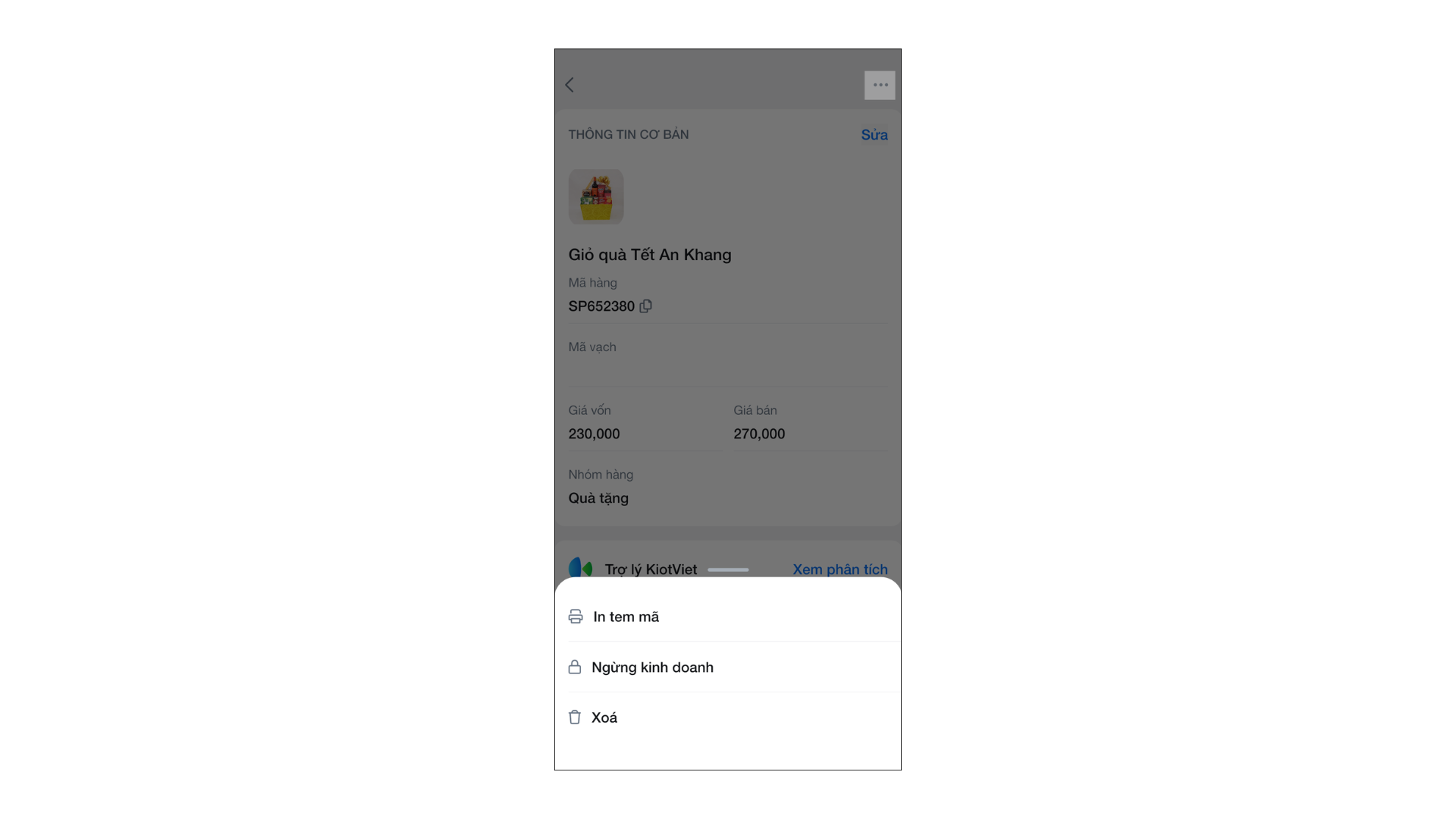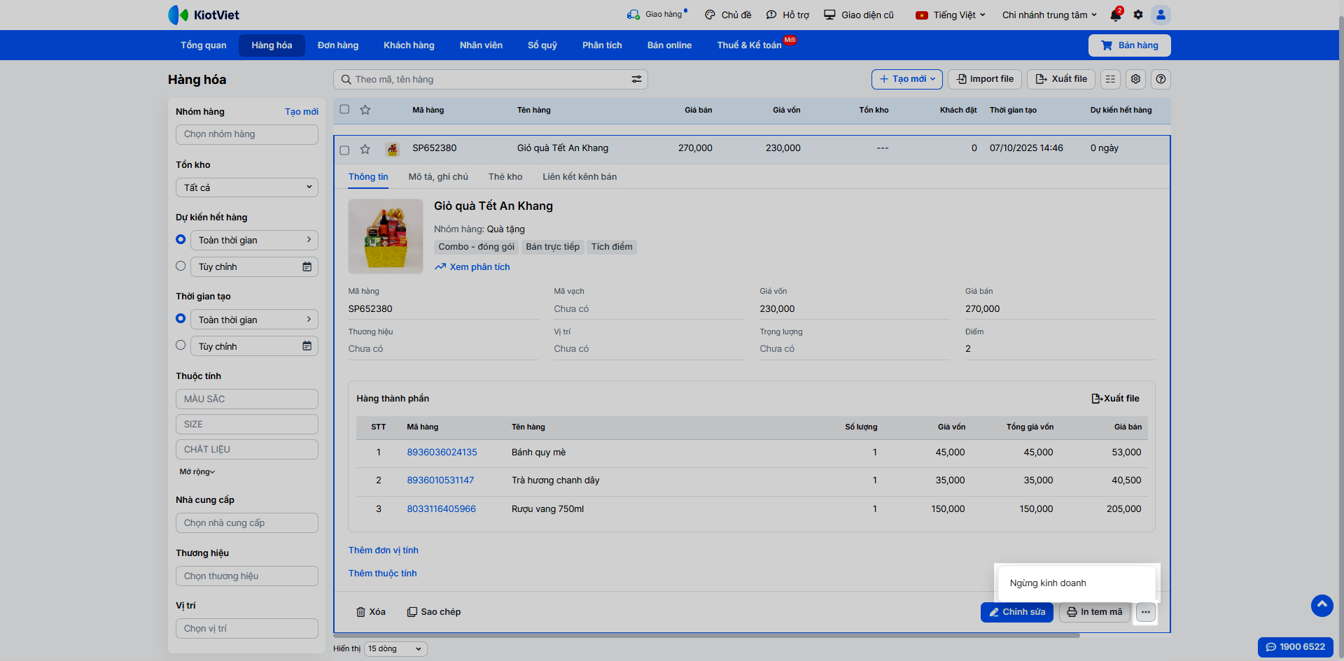 - Xóa/ Ngừng kinh doanh: Trong màn hình chi tiết hàng combo – đóng gói, chạm vào biểu tượng ba chấm (…) và chọn Xóa/ Ngừng kinh doanh.