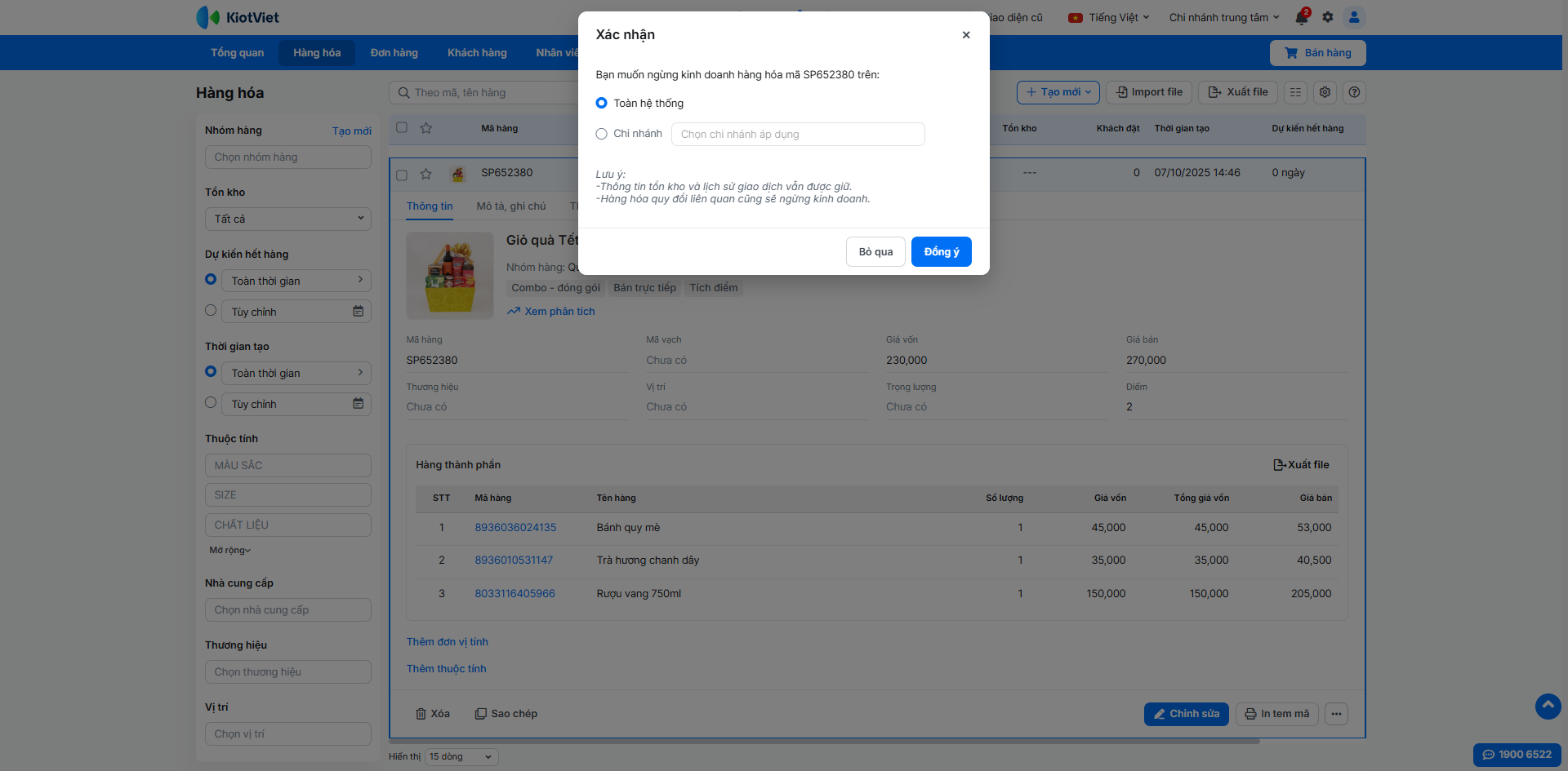 - Khi bán hàng: Mỗi khi một “Giỏ quà Tết” được bán ra, hệ thống sẽ không trừ tồn kho của chính giỏ quà mà sẽ tự động trừ tồn kho của từng mặt hàng thành phần (rượu, trà, bánh).