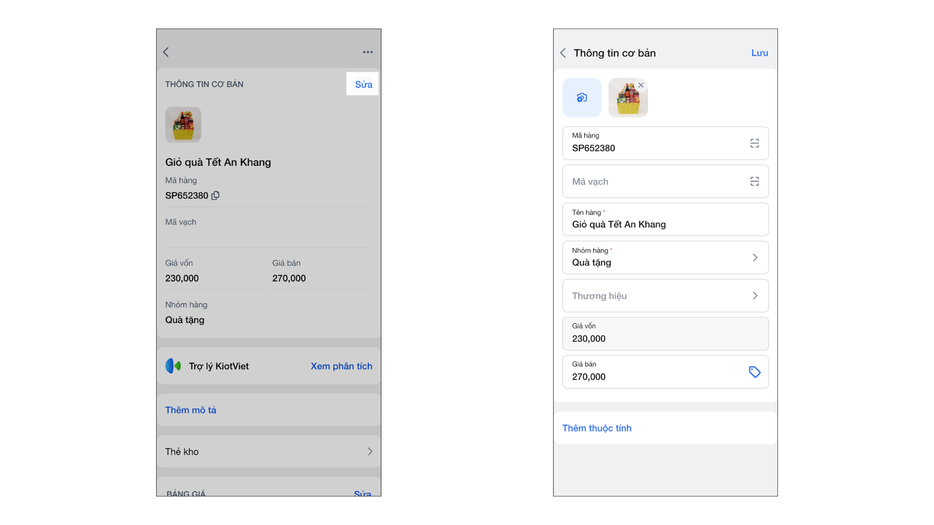 - Chỉnh sửa: Tại danh sách Hàng hóa, chạm vào combo – đóng gói cần sửa. Tại mỗi khu vực thông tin, chạm Sửa để cập nhật lại thông tin và Lưu.