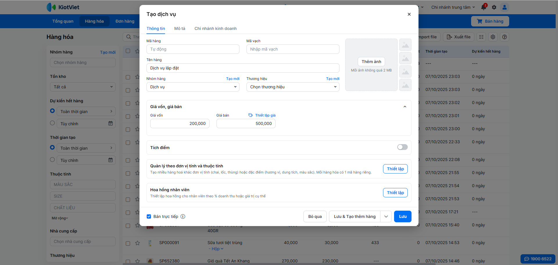 - Tích chọn “Bán trực tiếp” để dịch vụ này hiển thị trên màn hình Bán hàng.