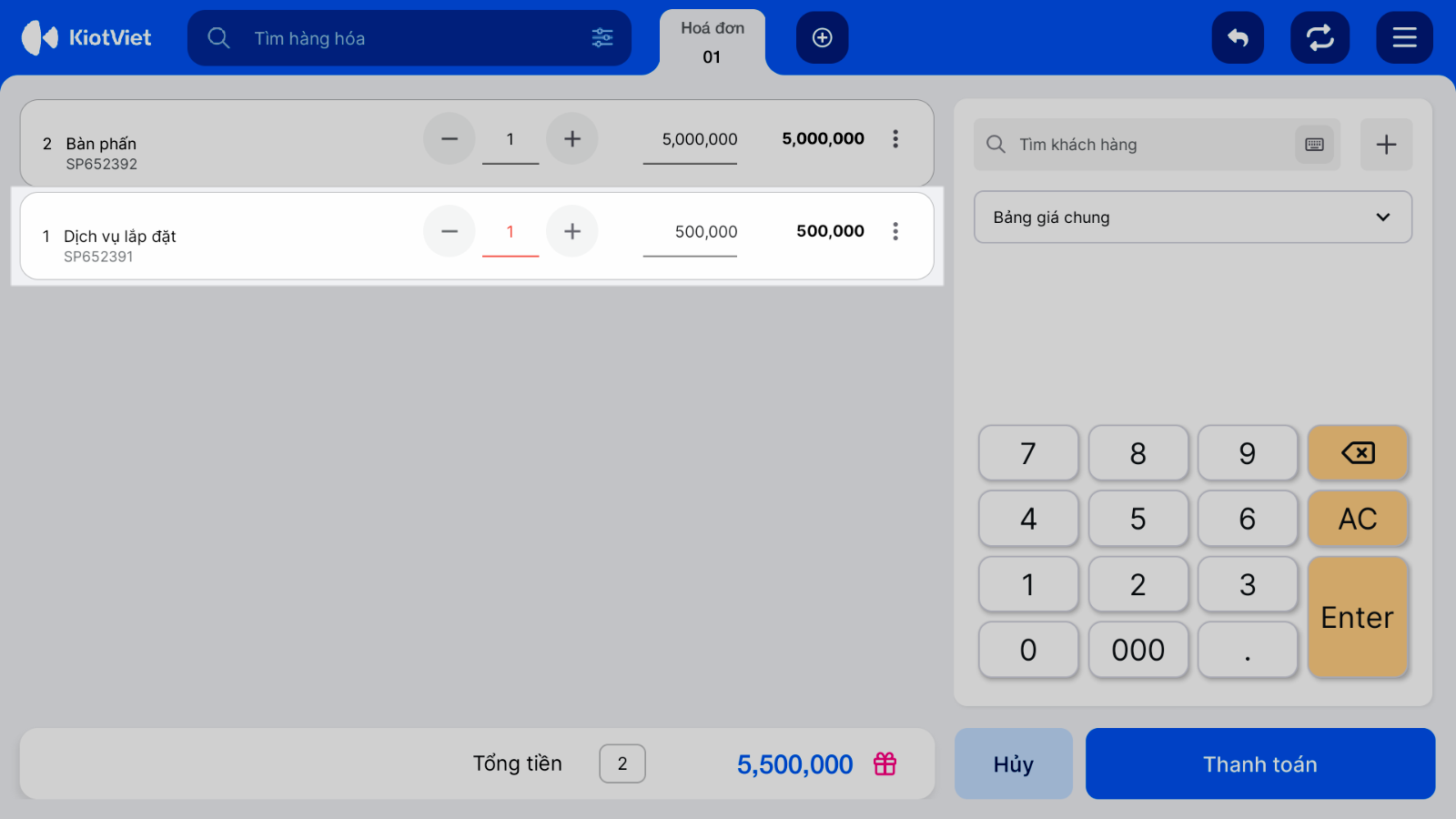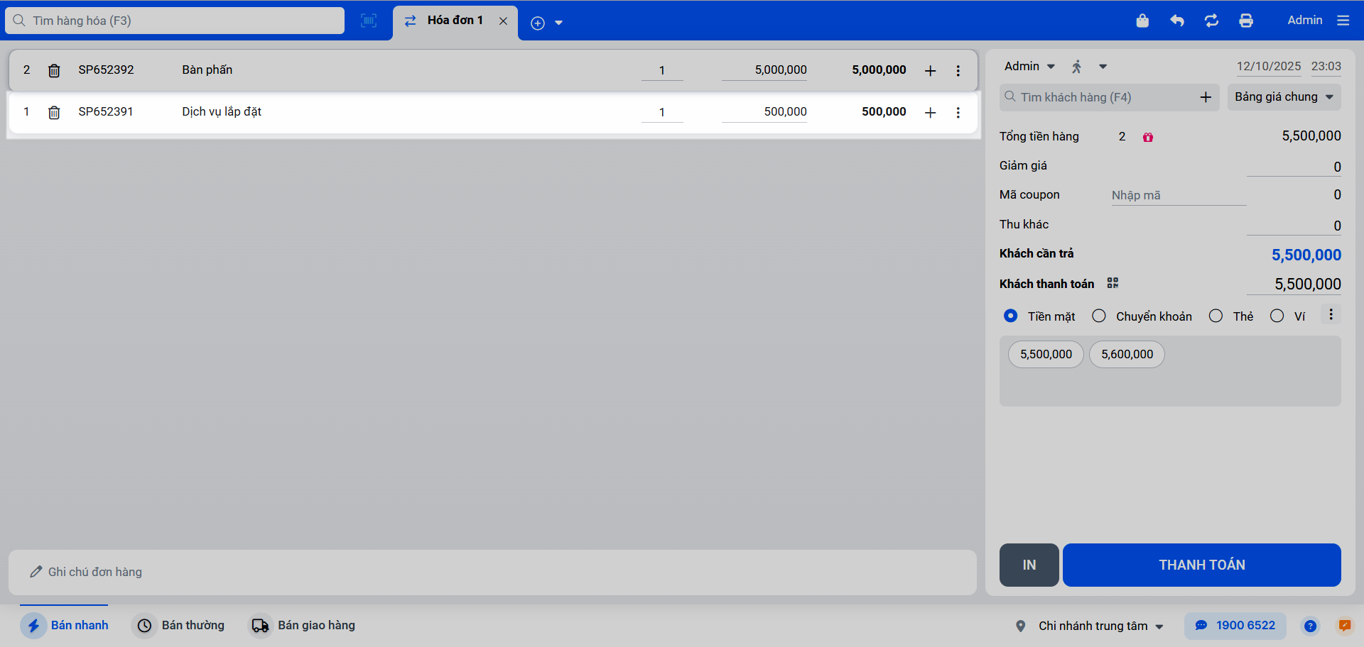 - Tình huống: Nhân viên thu ngân cần thêm “Dịch vụ lắp đặt” vào hóa đơn cho khách ngay tại quầy.