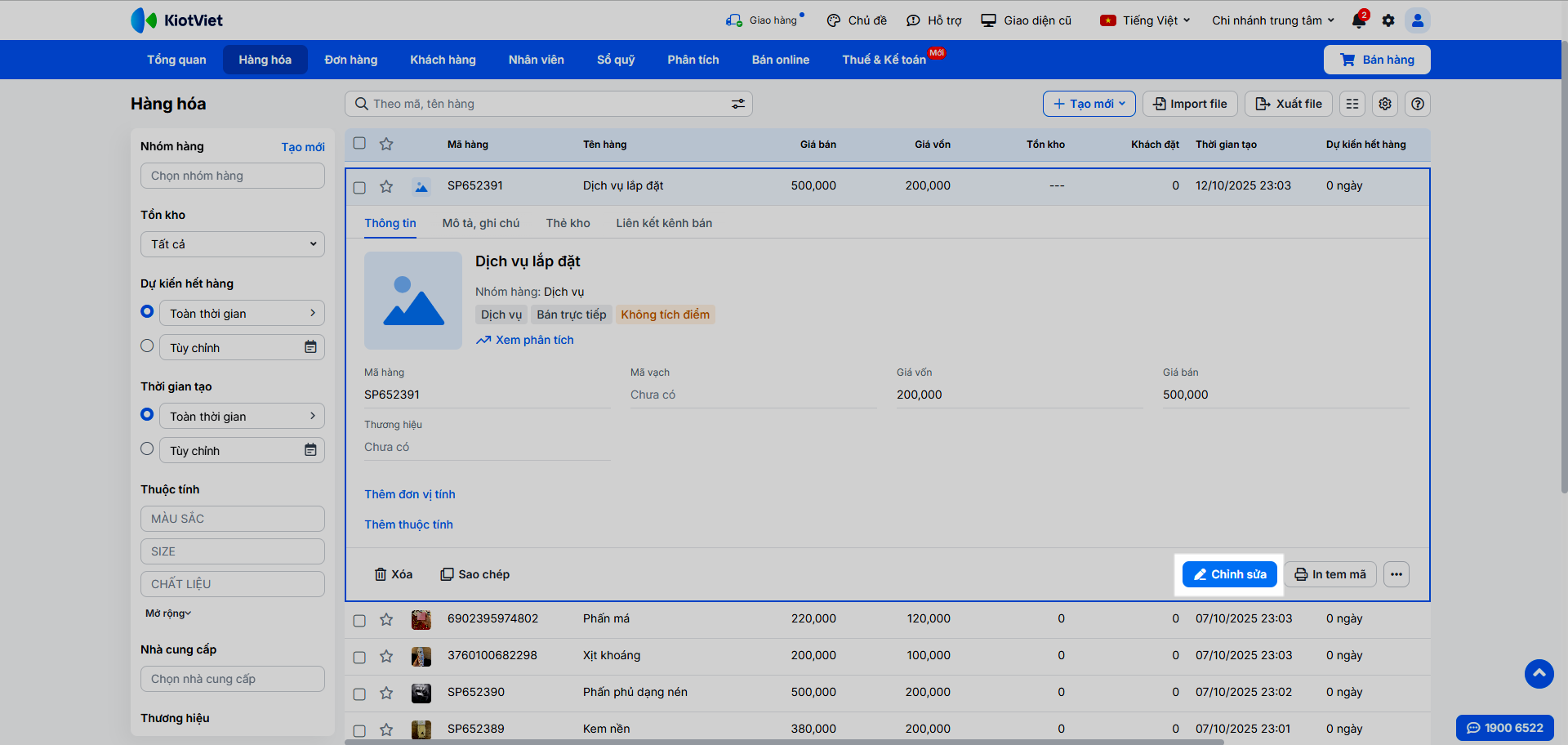 2. Chỉnh sửa/Xóa hàng dịch vụ