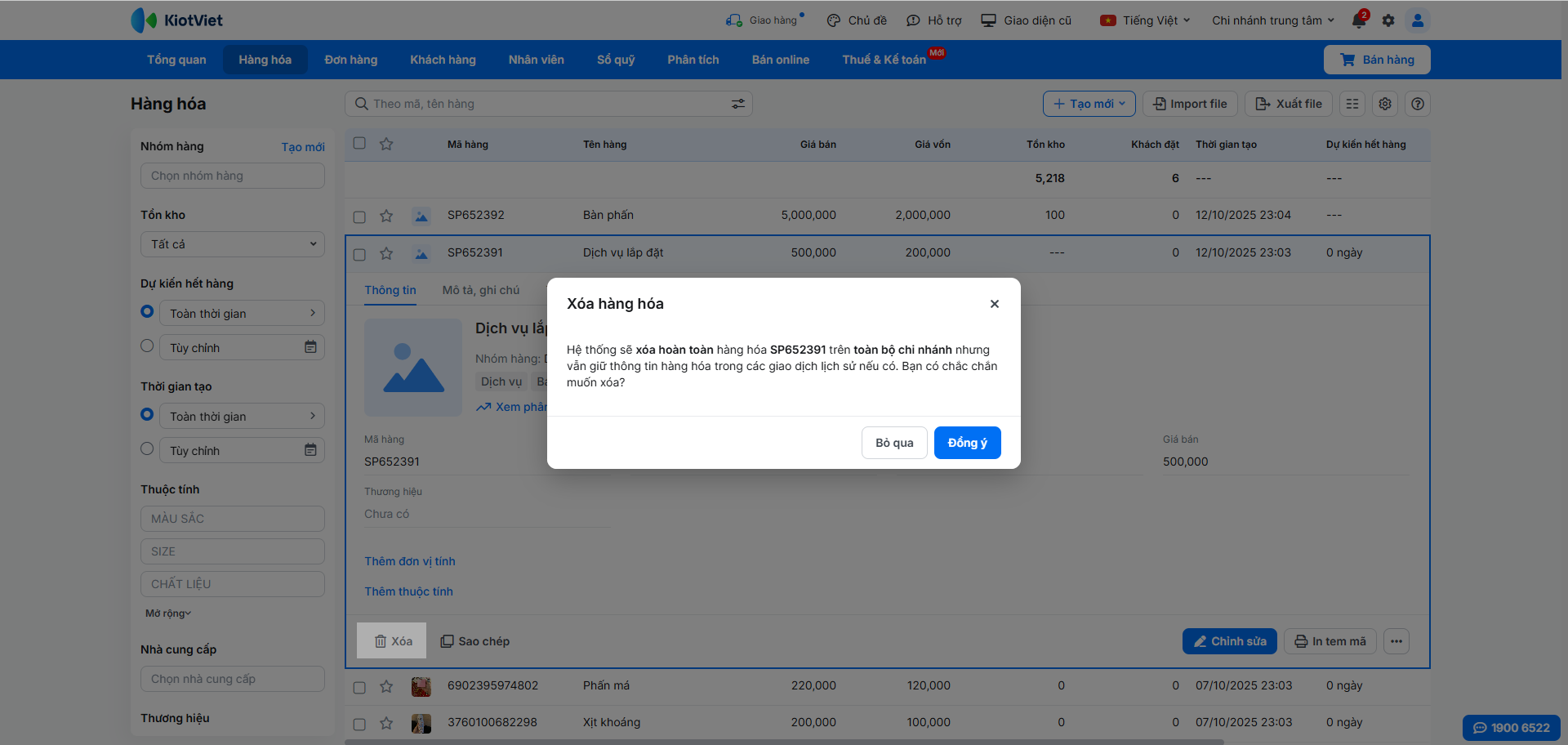 - Hệ thống sẽ xóa hoàn toàn hàng hóa trên toàn bộ chi nhánh nhưng vẫn giữ thông tin hàng hóa trong các giao dịch lịch sử nếu có. Khi xem lại các giao dịch, hàng hóa đã xóa sẽ có thêm hậu tố {DEL}.
