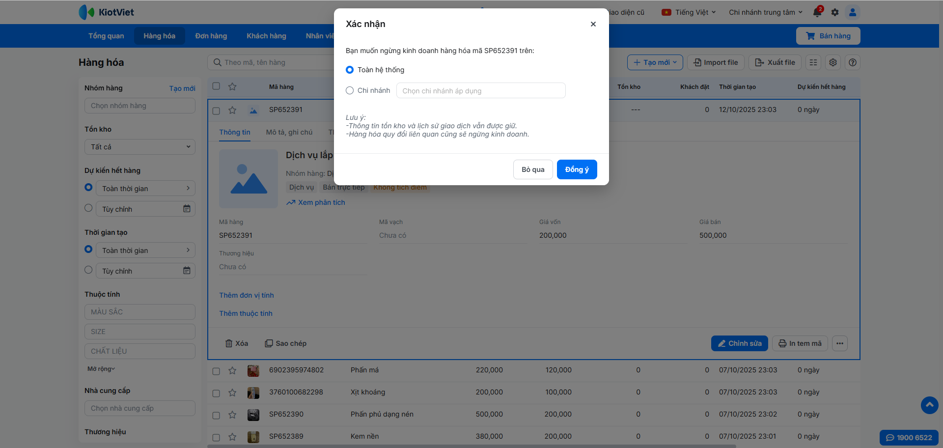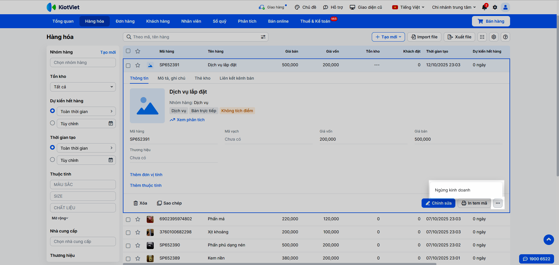 - Nếu đã phát sinh giao dịch, bạn nên sử dụng tính năng Ngừng kinh doanh để dễ dàng tìm kiếm theo thông tin hàng hóa.