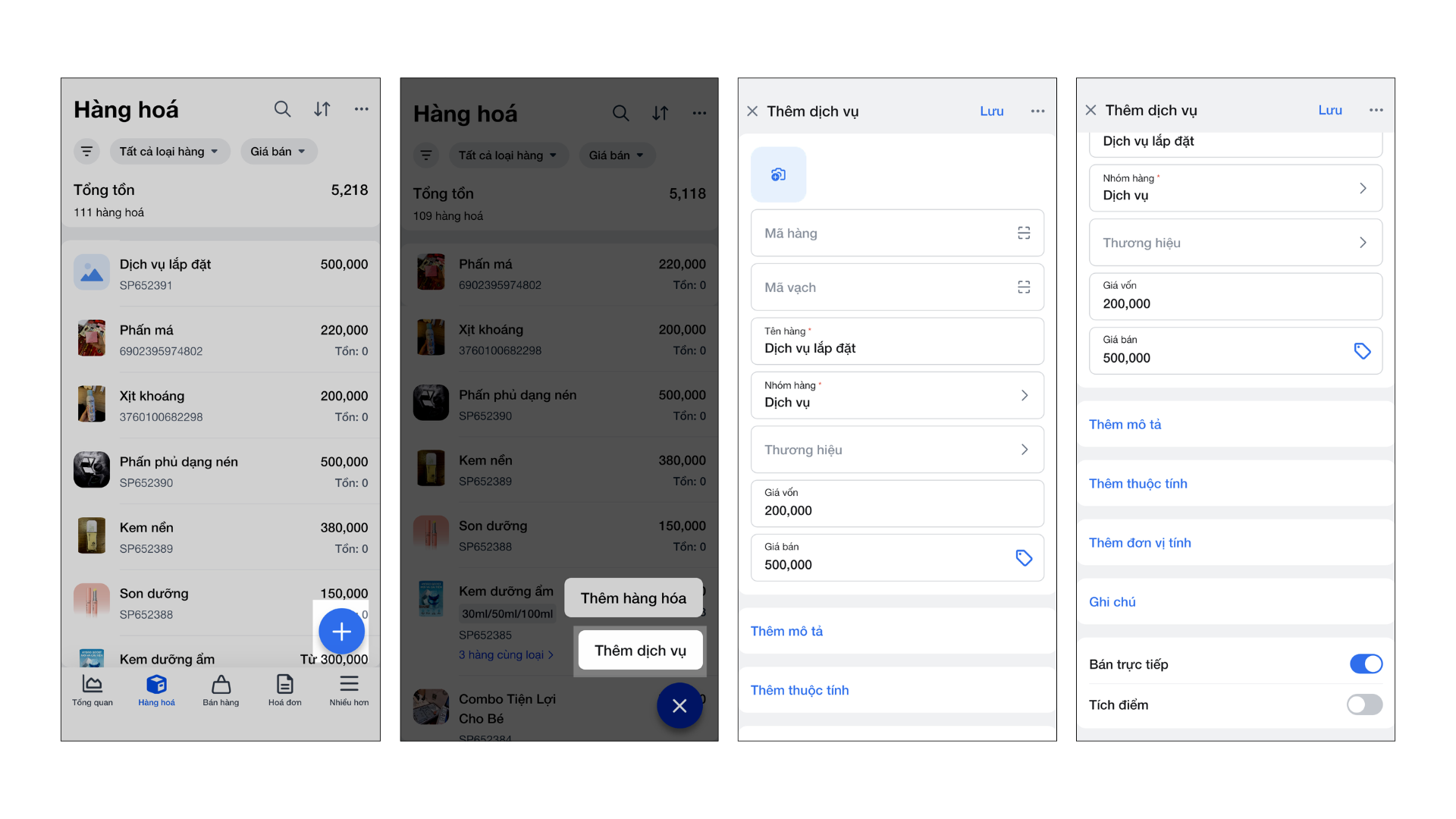 - Tình huống: Bạn cần thêm dịch vụ vào hóa đơn khi đang bán hàng bằng ứng dụng di động.