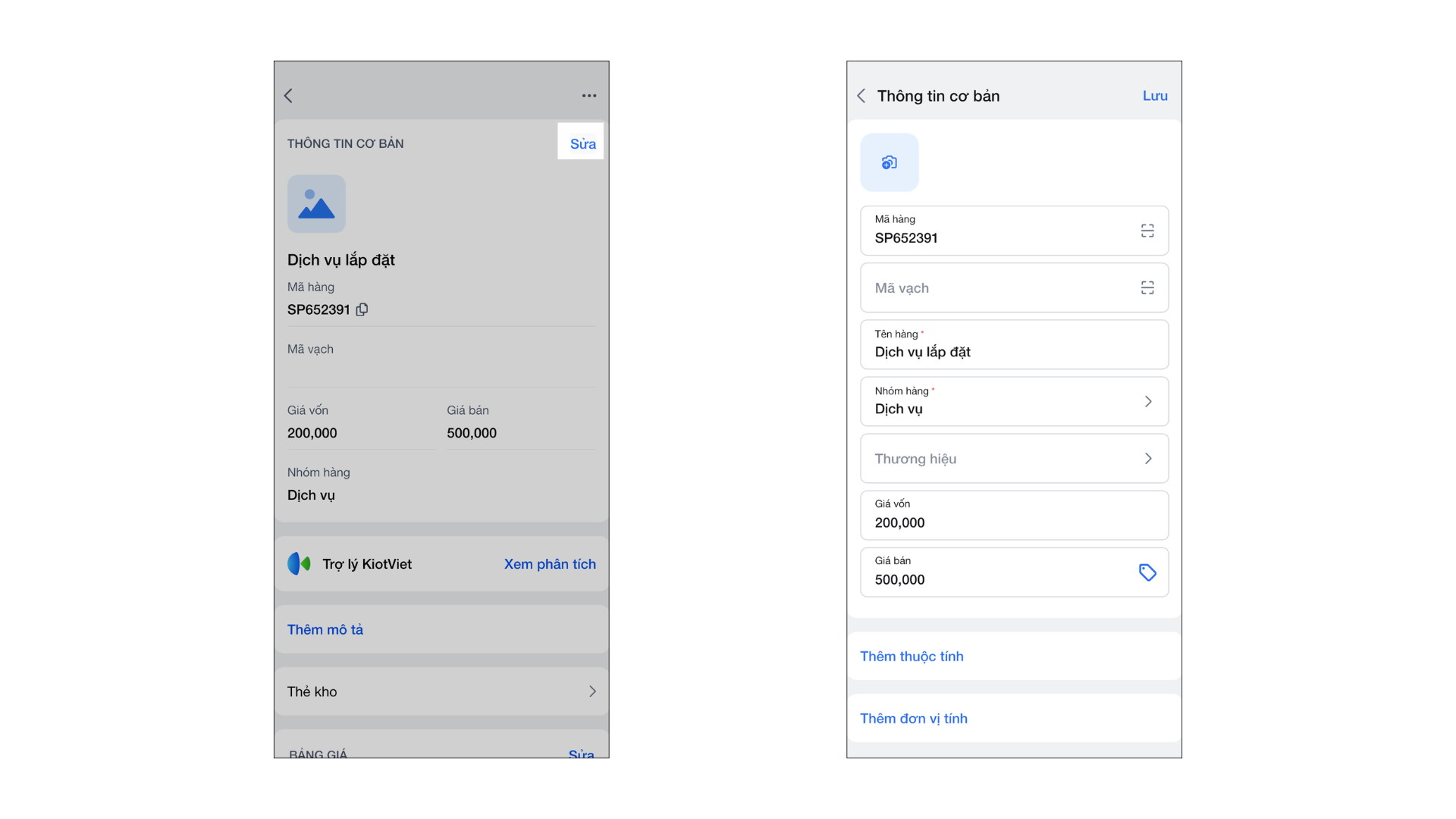 - Chỉnh sửa: Tại danh sách Hàng hóa, chạm vào dịch vụ cần sửa. Tại mỗi khu vực thông tin, chạm Sửa để cập nhật lại thông tin và Lưu.