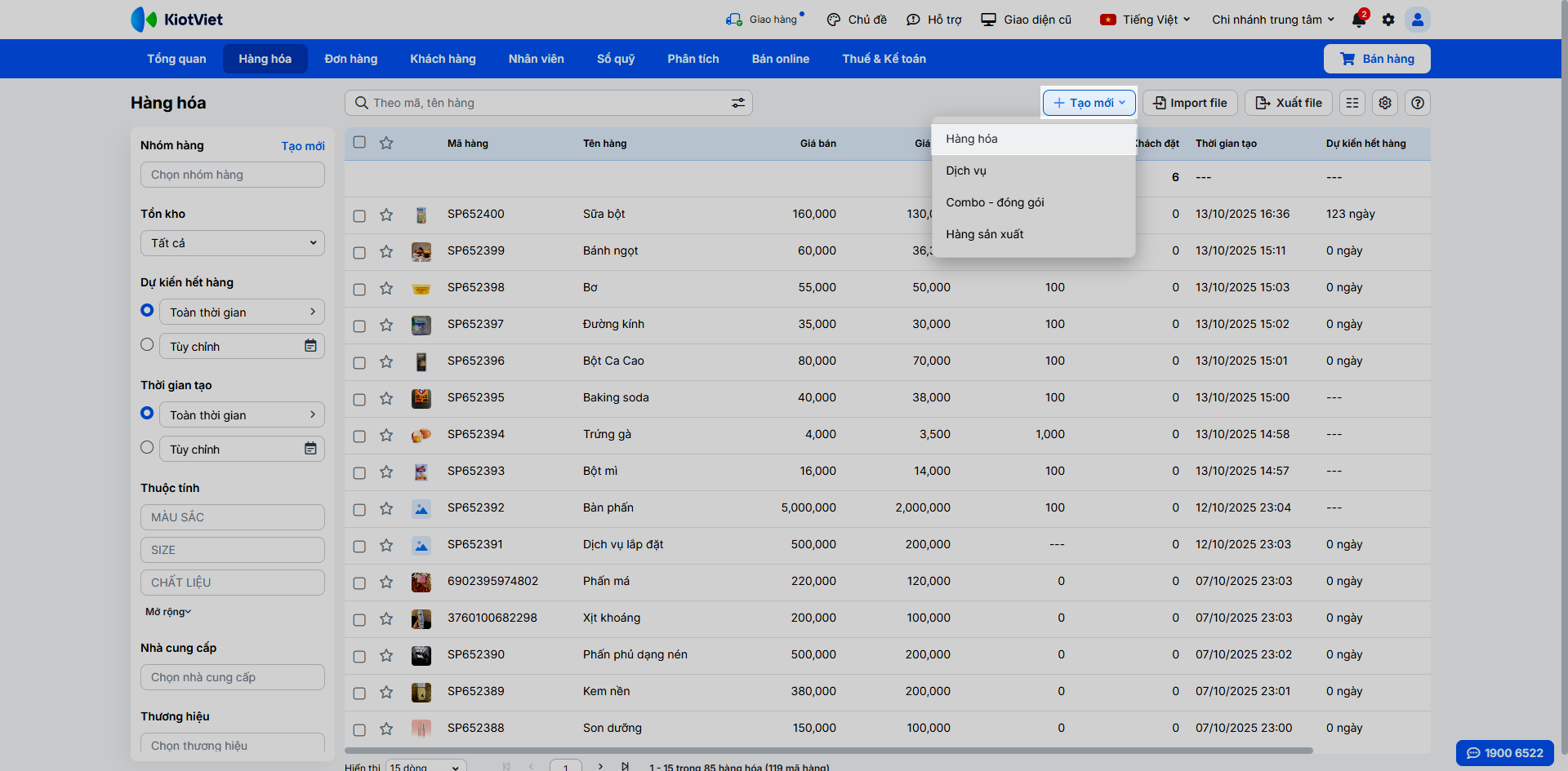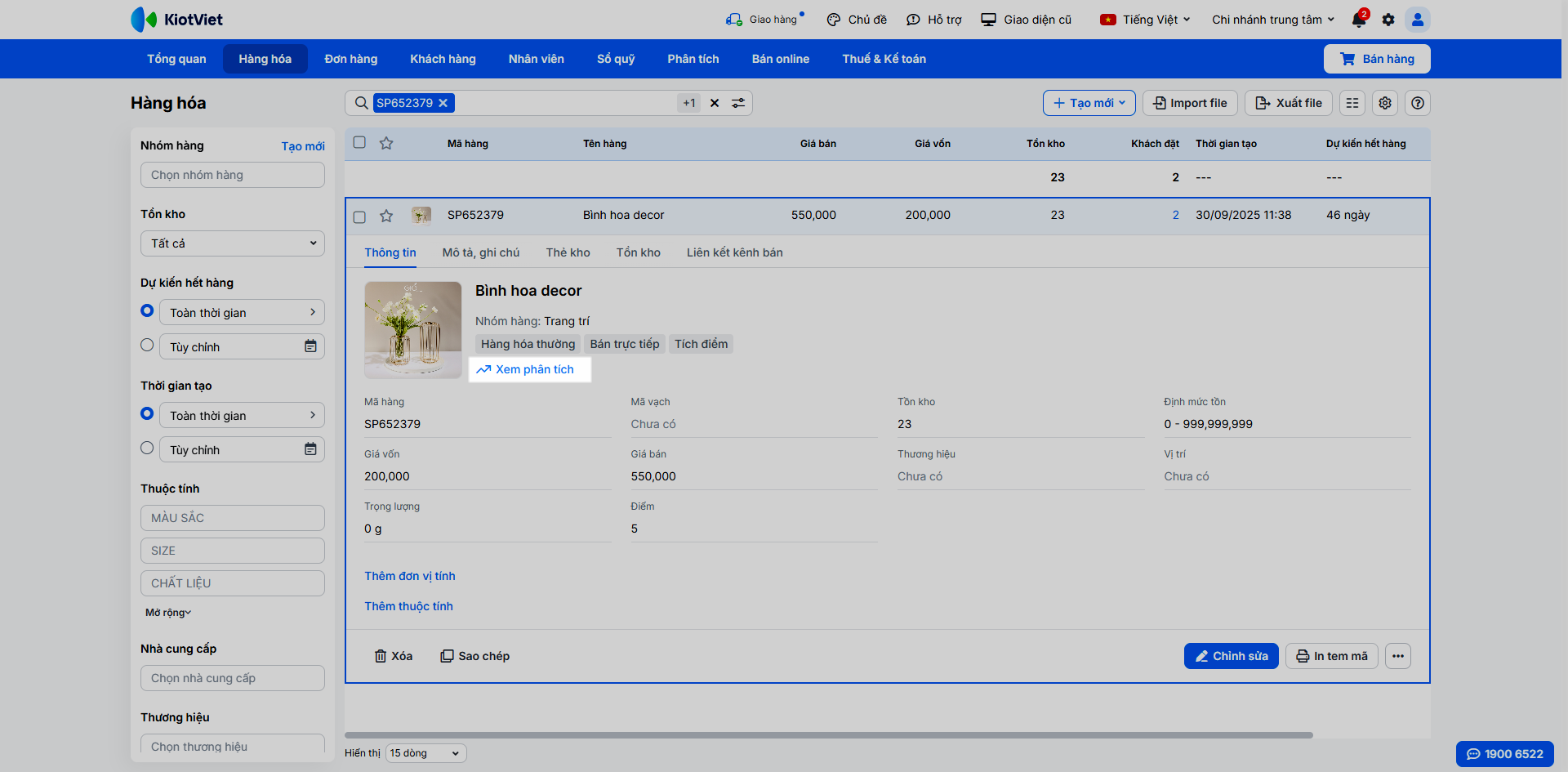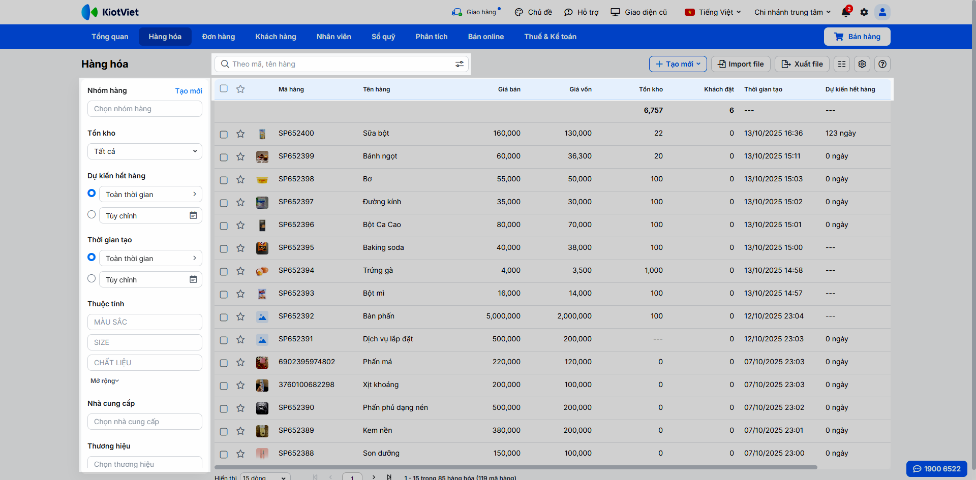 - Sử dụng bộ lọc chi tiết ở cột trái để tìm kiếm theo nhiều tiêu chí như: Nhóm hàng, Tồn kho, Dự kiến hết hàng, Thời gian tạo, Thuộc tính, Nhà cung cấp, Thương hiệu, Vị trí, Loại hàng, Tích điểm, Bán trực tiếp, Liên kết kênh bán, Trạng thái hàng hóa.