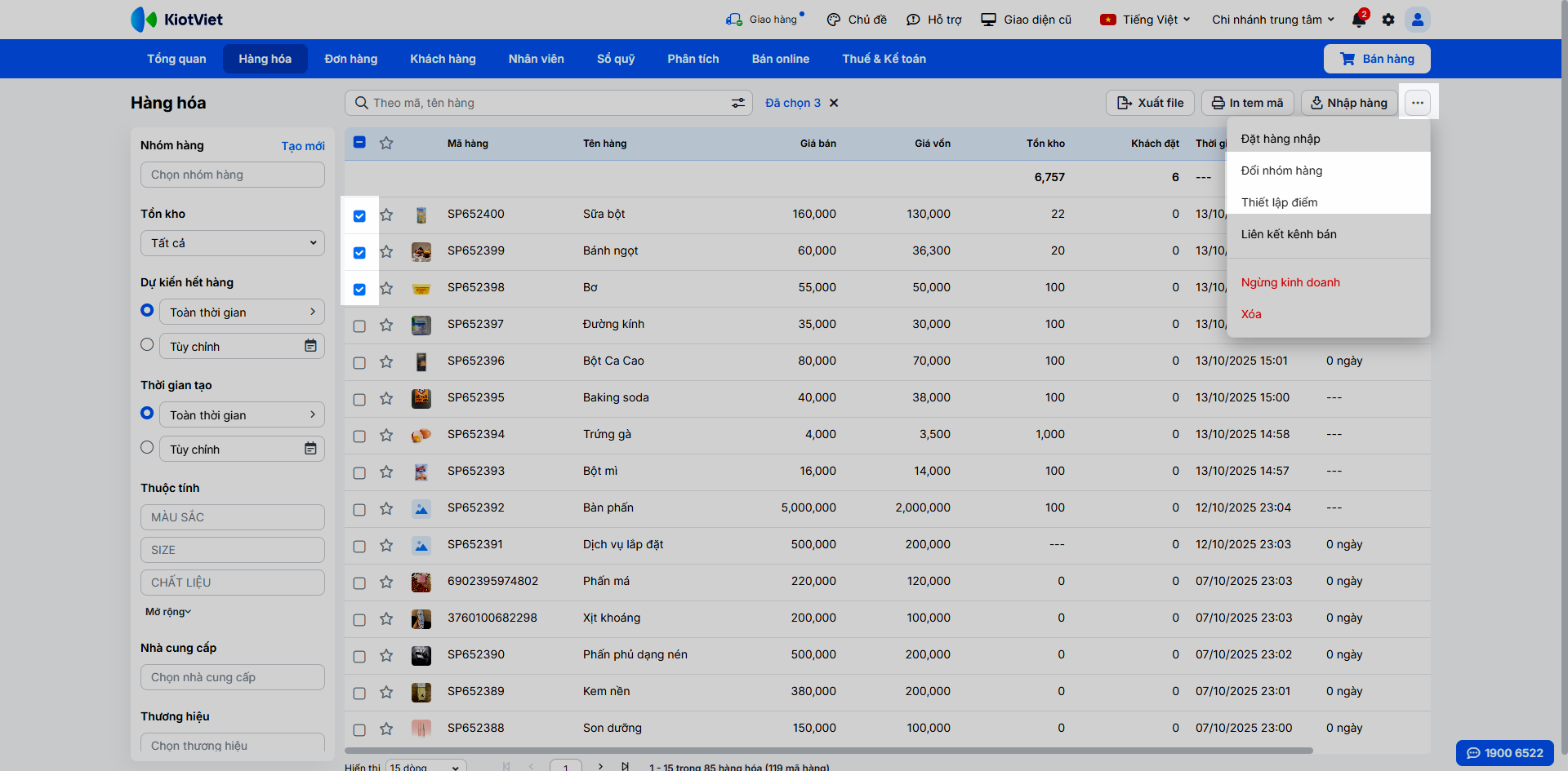 - Bạn cũng có thể chỉnh sửa các thông tin về nhóm hàng hoặc điểm cho nhiều sản phẩm bằng cách tích chọn các sản phẩm → nhấn 3 chấm và chọn thao tác cần thực hiện: