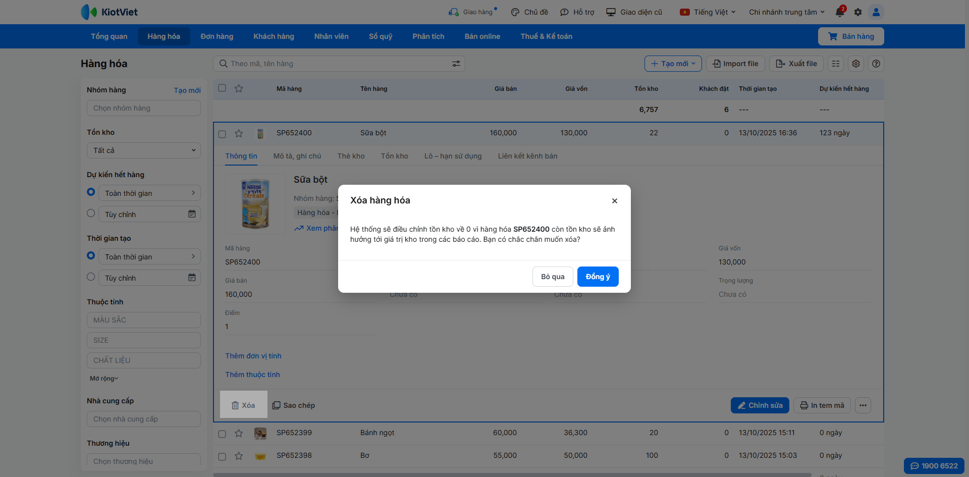 - Hệ thống sẽ xóa hoàn toàn hàng hóa trên toàn bộ chi nhánh nhưng vẫn giữ thông tin hàng hóa trong các giao dịch lịch sử nếu có. Khi xem lại các giao dịch, hàng hóa đã xóa sẽ có thêm hậu tố {DEL}.