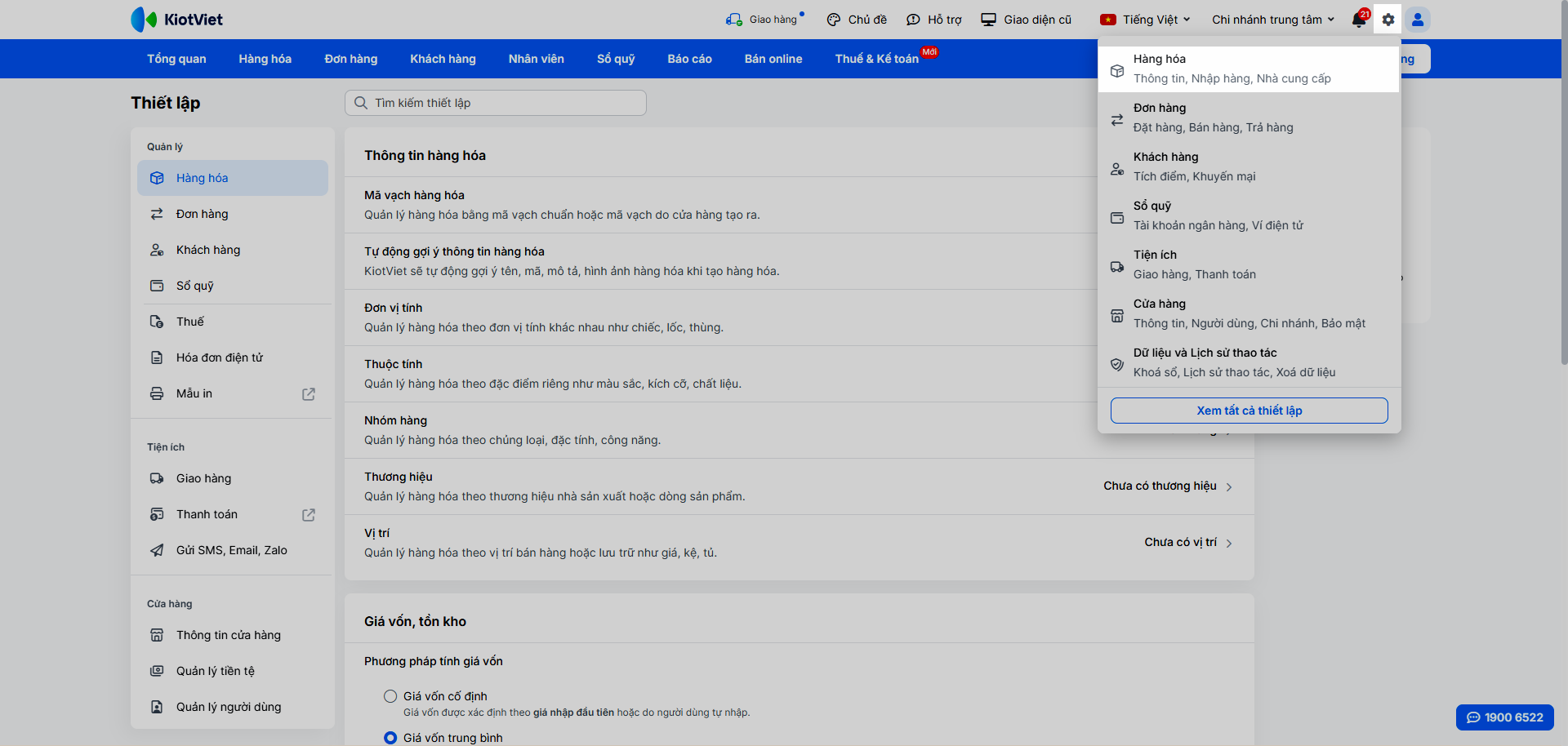 - Tại màn hình Quản lý, vào Thiết lập → Hàng hóa.