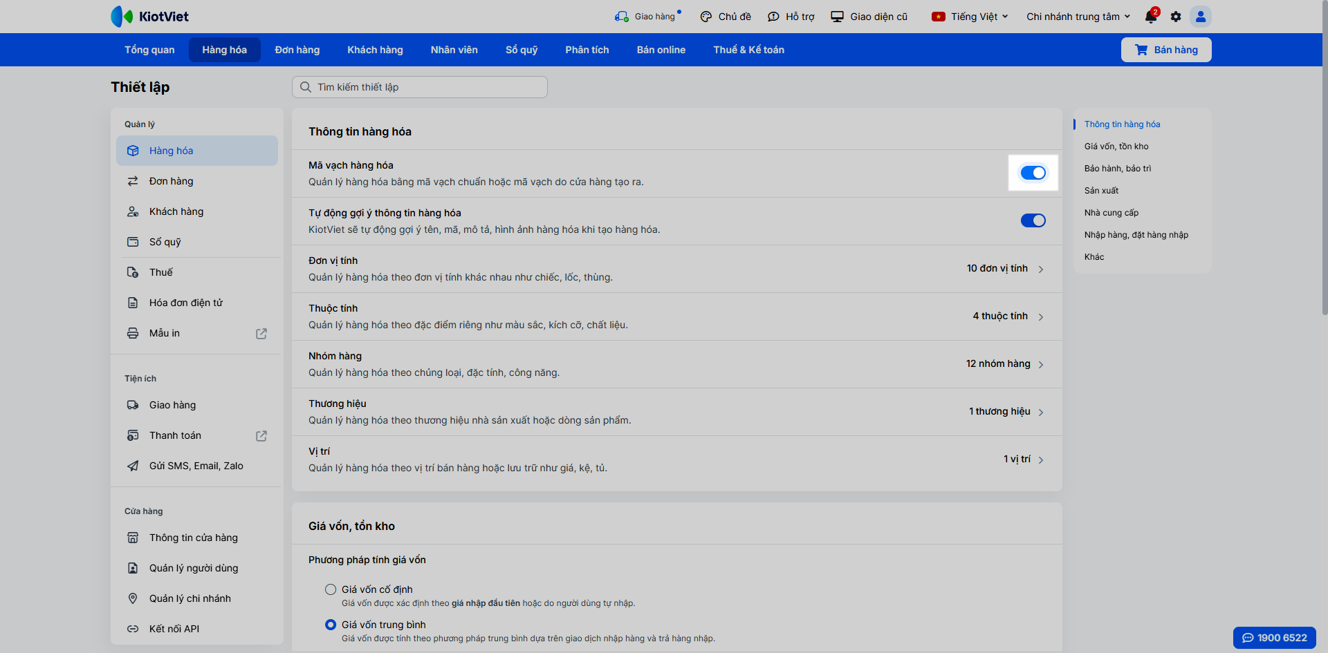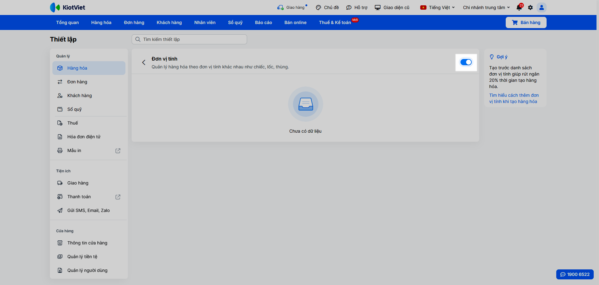 - Tại màn hình Quản lý, vào Thiết lập → Hàng hóa → bật xanh tính năng