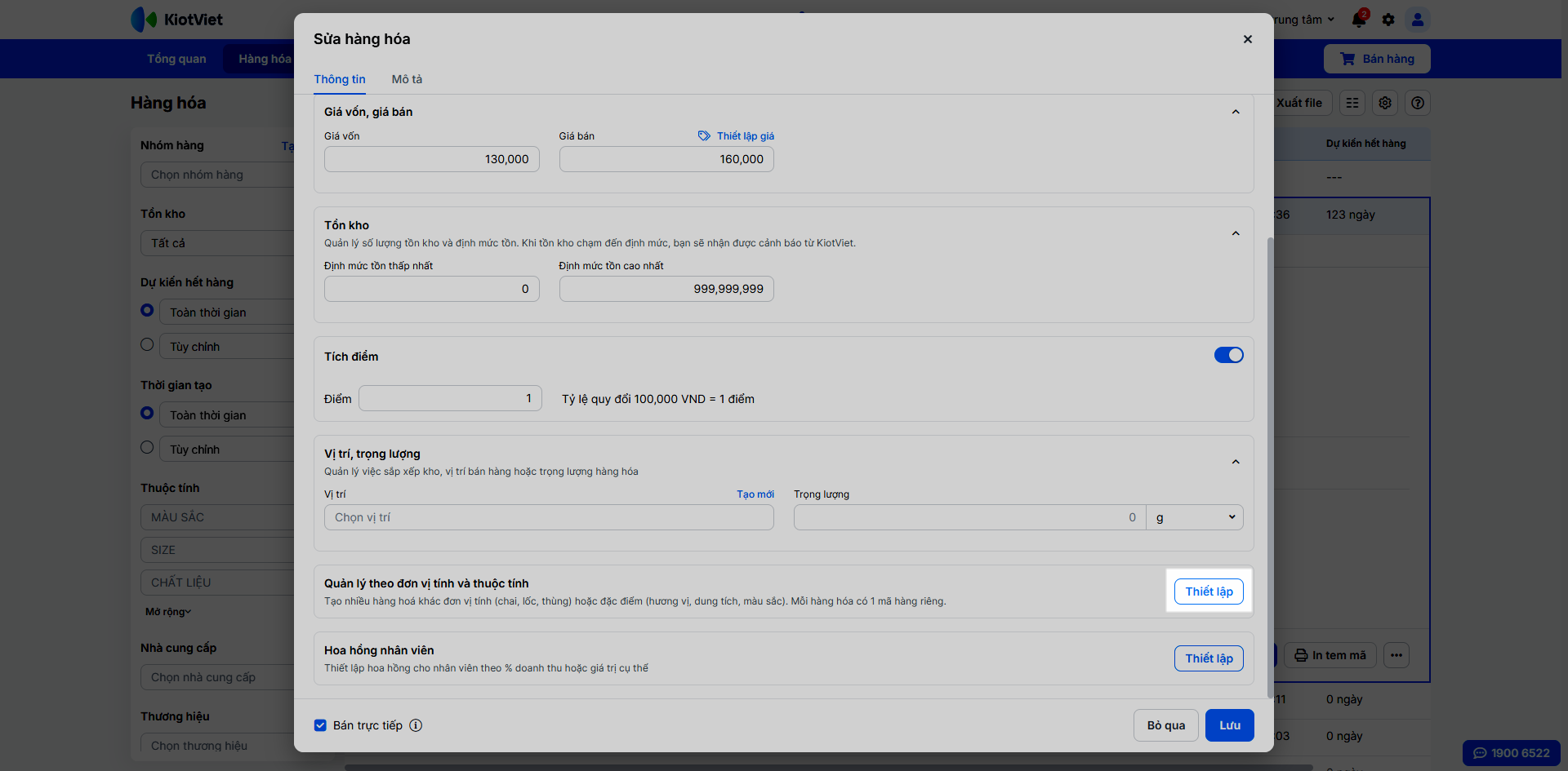 - Khi tạo mới/ chỉnh sửa hàng hóa: Tại mục Quản lý theo đơn vị tính và thuộc tính, bạn nhấn Thiết lập để tạo: