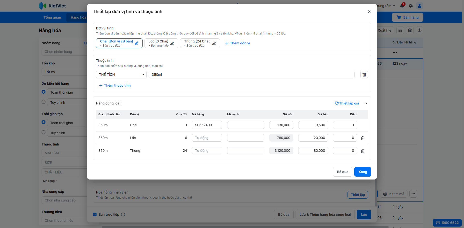 - Đơn vị tính như: chai, lốc, thùng. Đặt công thức quy đổi để tính nhanh giá và tồn kho. Ví dụ: 1 lốc = 4 chai, 1 thùng = 20 lốc.
