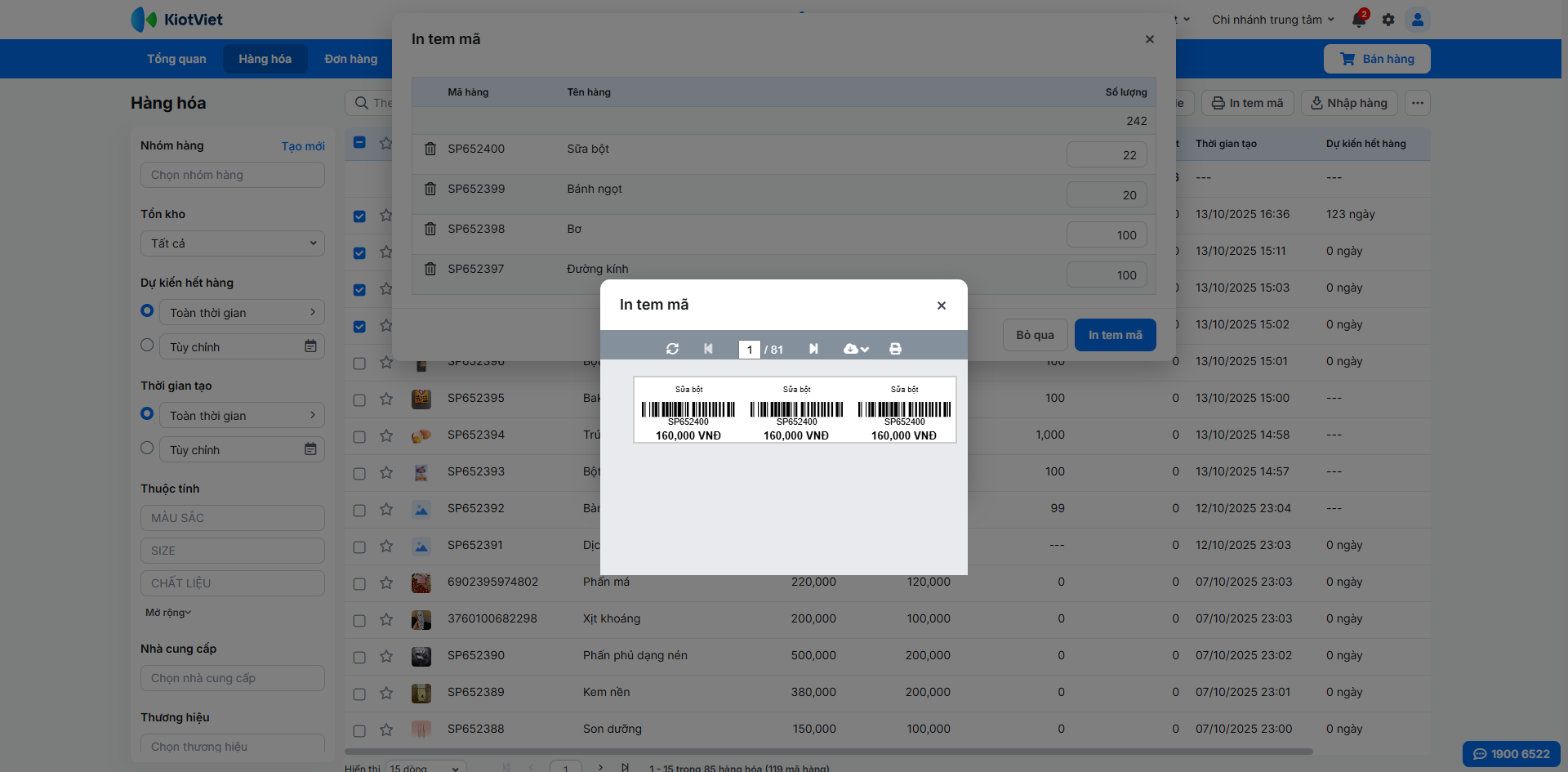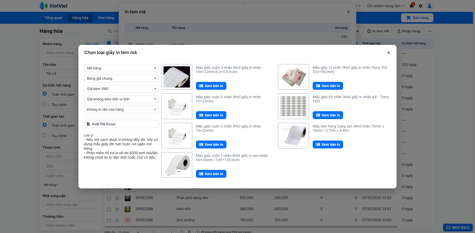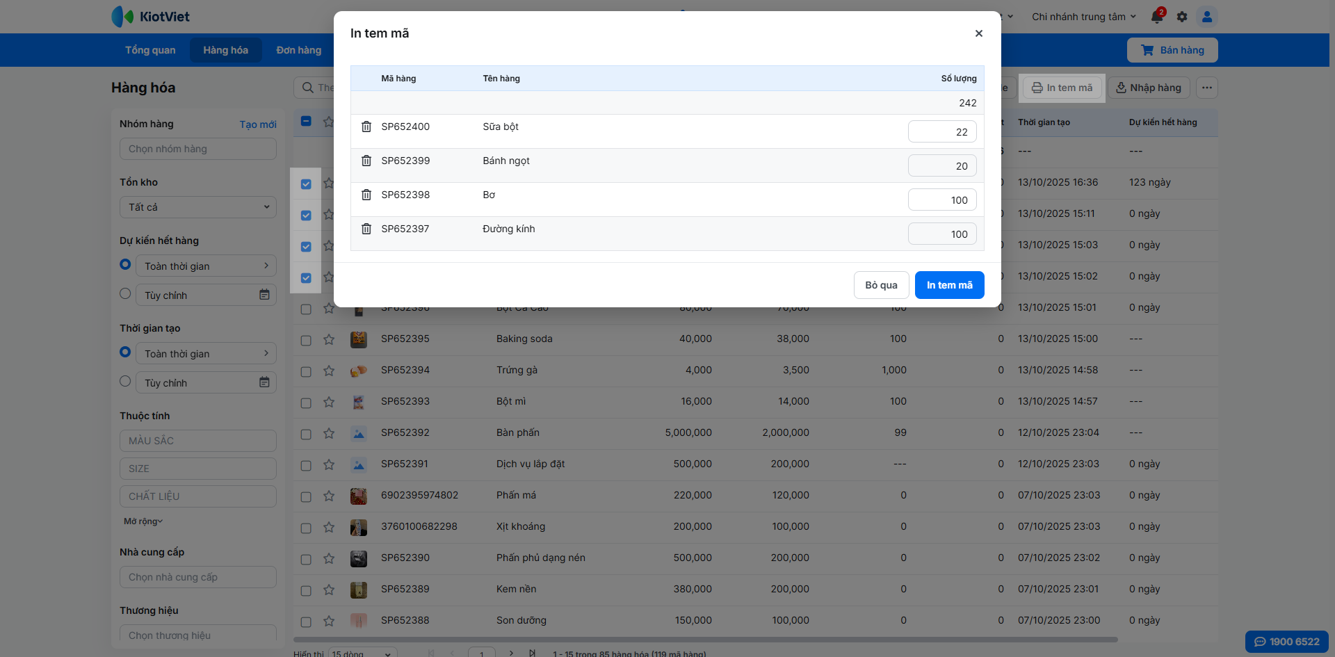 - Nhấn In tem mã, nhập số lượng tem cho mỗi loại → tiếp tục nhấn In tem mã.