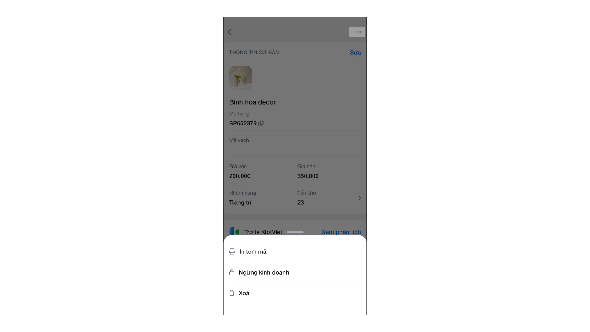 - Ngừng kinh doanh/Xóa: Trong màn hình chi tiết hàng hóa, chạm vào biểu tượng ba chấm (…) và chọn Ngừng kinh doanh hoặc Xóa.