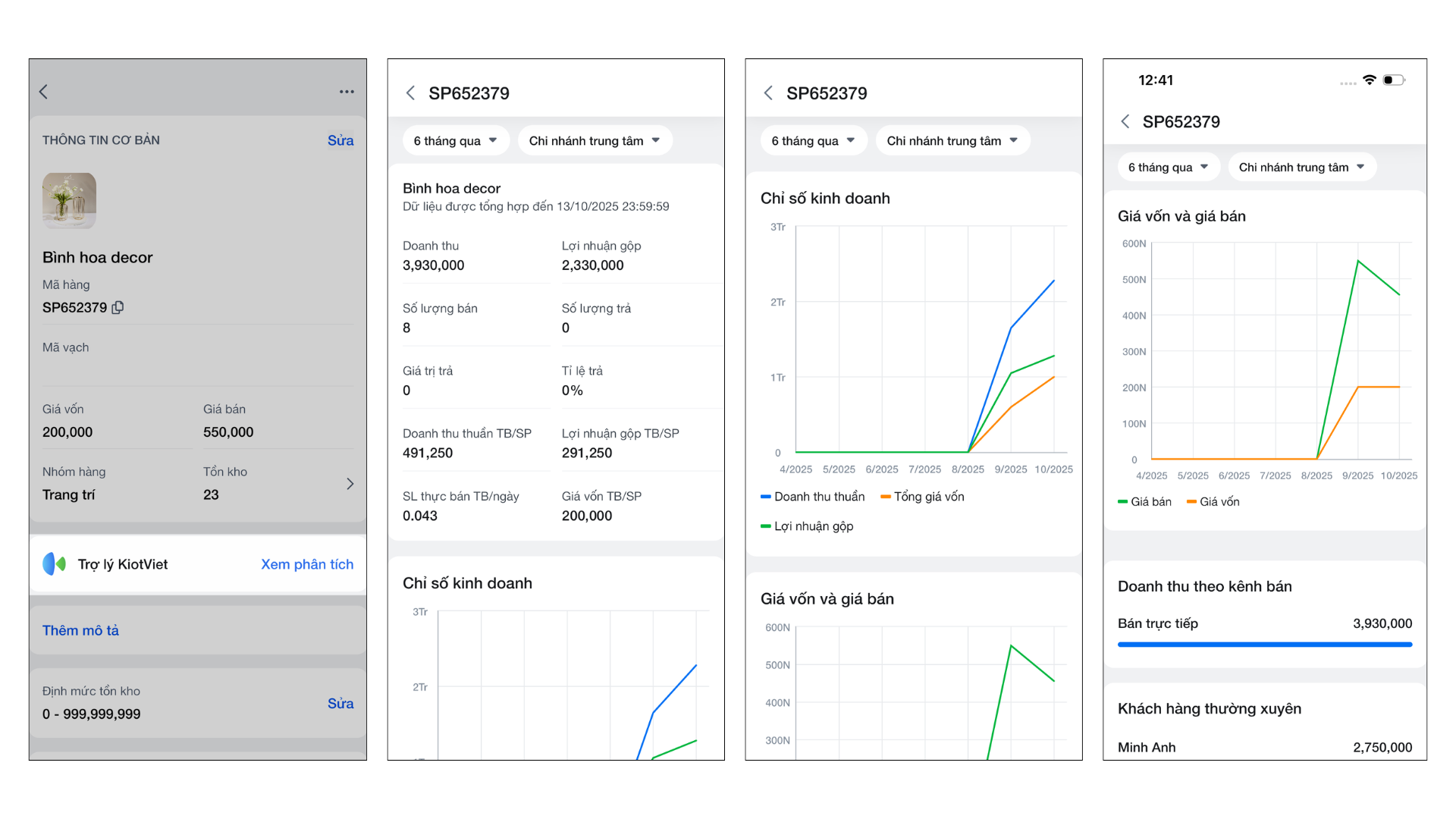- Thao tác thực hiện như sau: Trong chi tiết hàng hóa, chạm vào Xem phân tích. Hệ thống sẽ hiển thị các biểu đồ và chỉ số quan trọng như Doanh thu, Lợi nhuận, và danh sách khách hàng thường xuyên mua sản phẩm này.