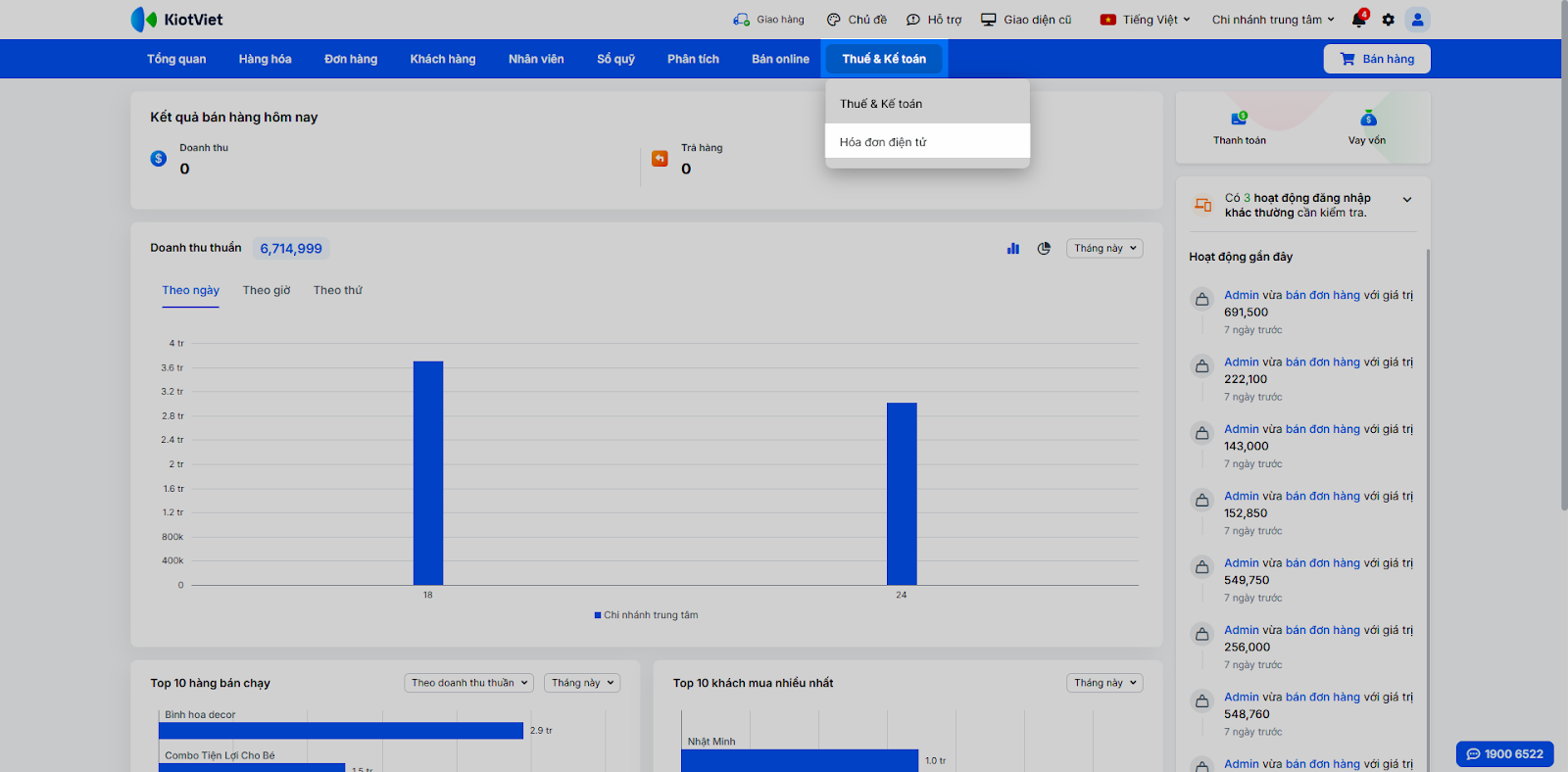 - Quản lý tập trung: Nếu bạn kinh doanh chuỗi hoặc có nhiều chi nhánh với các Mã số thuế khác nhau, tính năng này hỗ trợ quản lý tất cả trên cùng một tài khoản KiotViet, rất thuận tiện cho việc theo dõi.