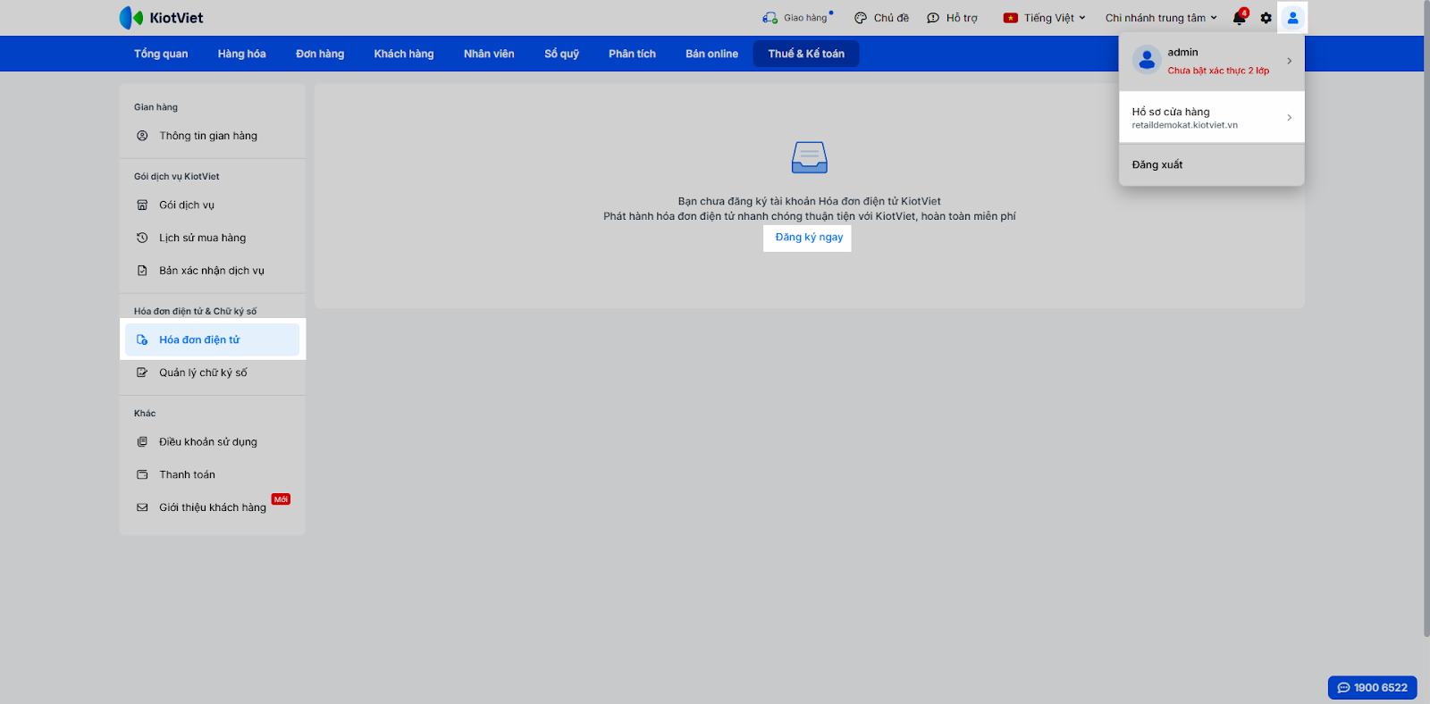 - Tình huống: Cửa hàng đã có tài khoản phần mềm Quản lý bán hàng KiotViet có nhu cầu kích hoạt sử dụng tính năng Hóa đơn điện tử KiotViet.