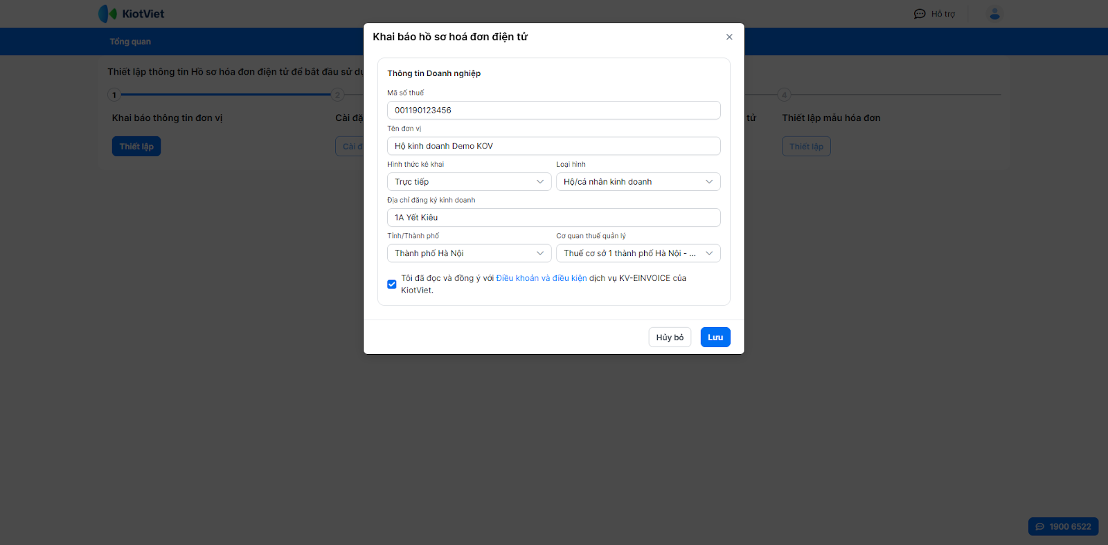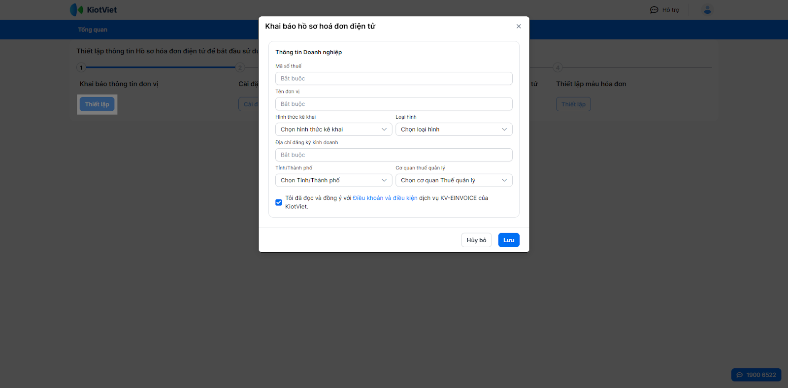 - Tích chọn vào ô Tôi đã đọc và đồng ý với Điều khoản và điều kiện dịch vụ KV-EINVOICE của KiotViet.