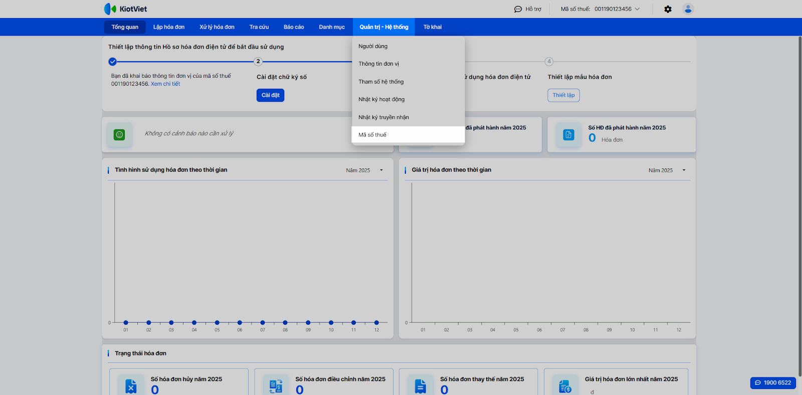 - Trên giao diện phần mềm Hóa đơn điện tử KiotViet, từ menu Quản trị – Hệ thống → chọn Mã số thuế.