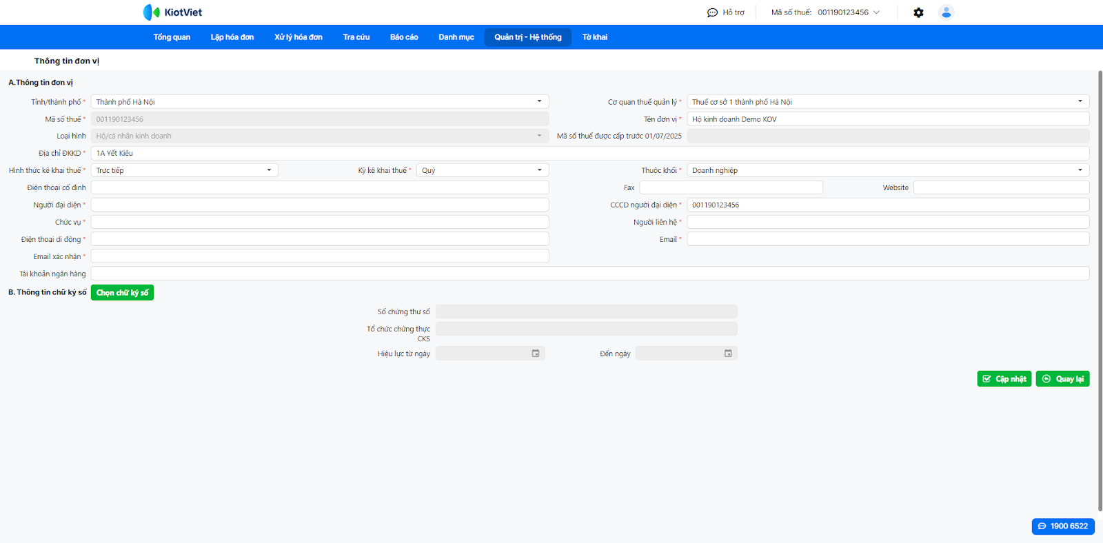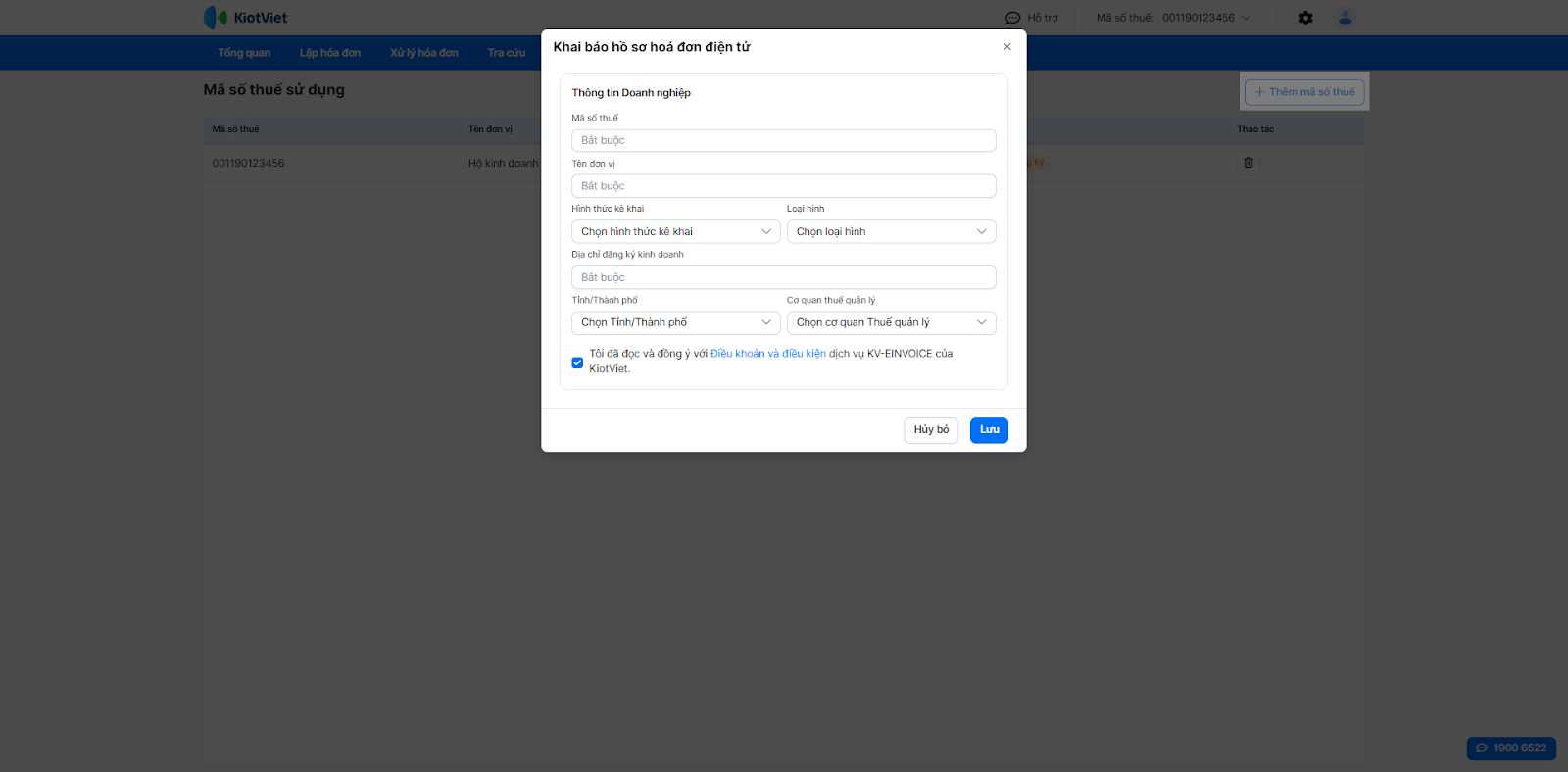 - Trên popup, bạn điền đầy đủ các thông tin: Mã số thuế, Tên đơn vị, Hình thức kê khai, Loại hình, Địa chỉ đăng ký kinh doanh, Tỉnh/Thành phố, Cơ quan thuế quản lý.