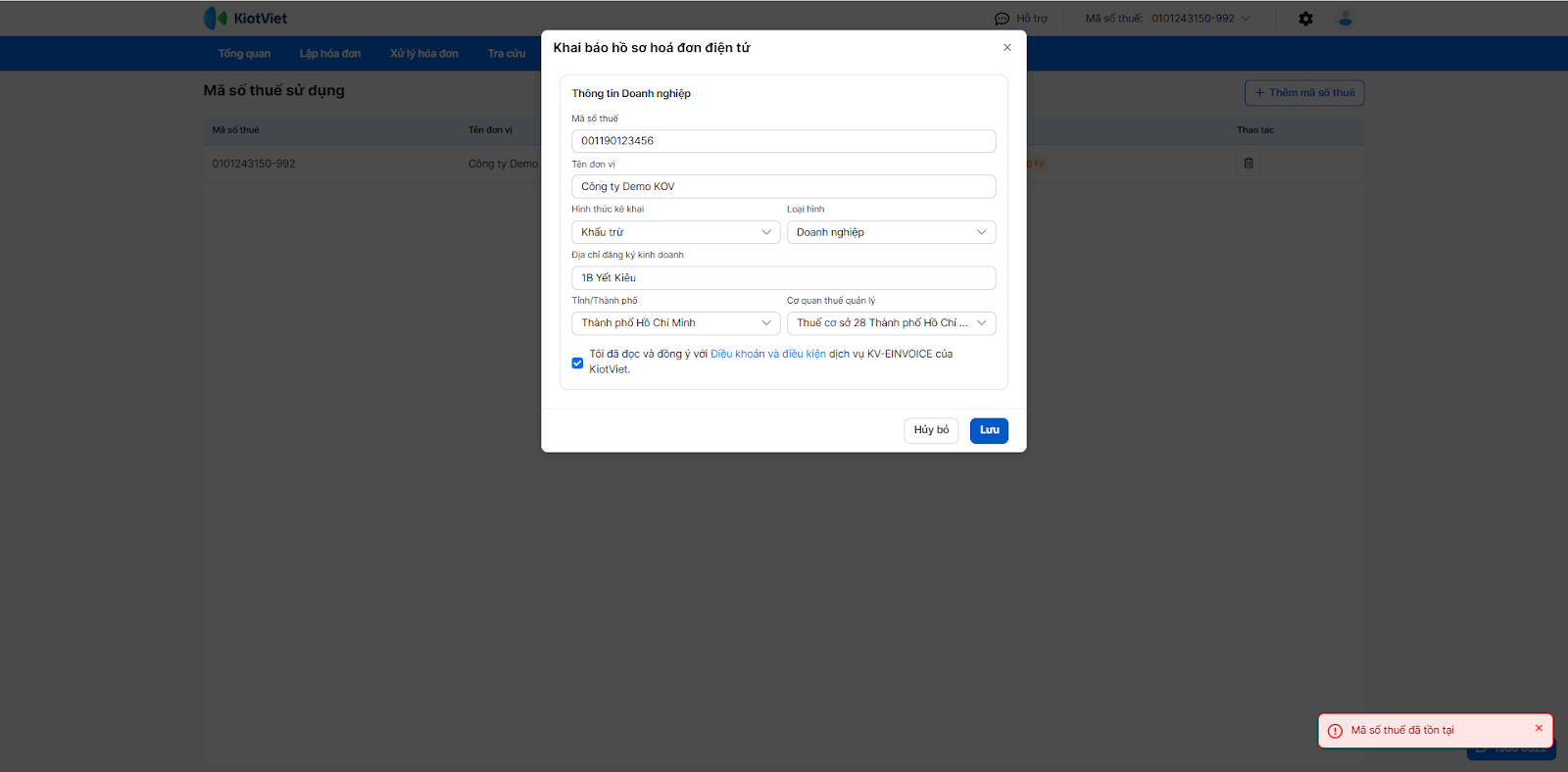 - Tình huống: Khi khai báo hồ sơ hóa đơn điện tử, hệ thống hiện thông báo: Mã số thuế đã tồn tại.