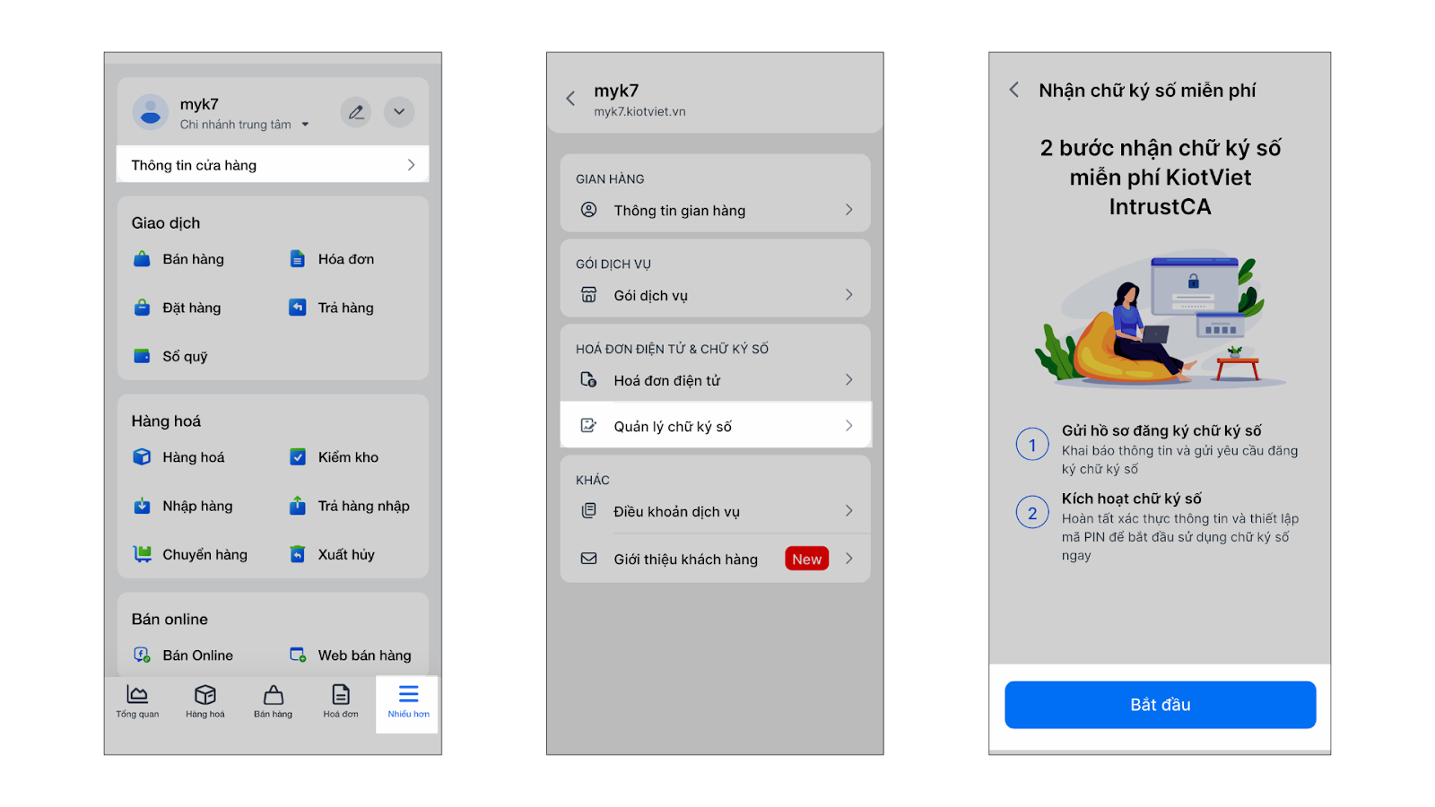 - Đầu tiên, chủ gian hàng (tài khoản Admin) đăng nhập ứng dụng KiotViet, chọn Nhiều hơn → Thông tin cửa hàng → Quản lý chữ ký số và chạm Bắt đầu.