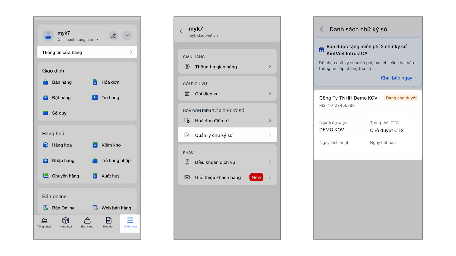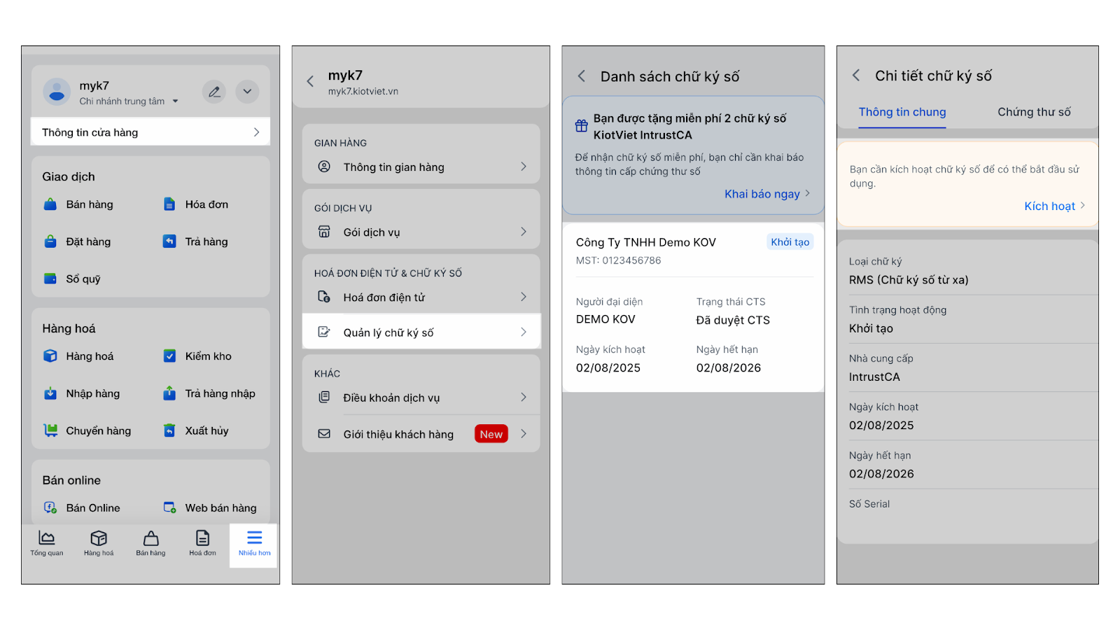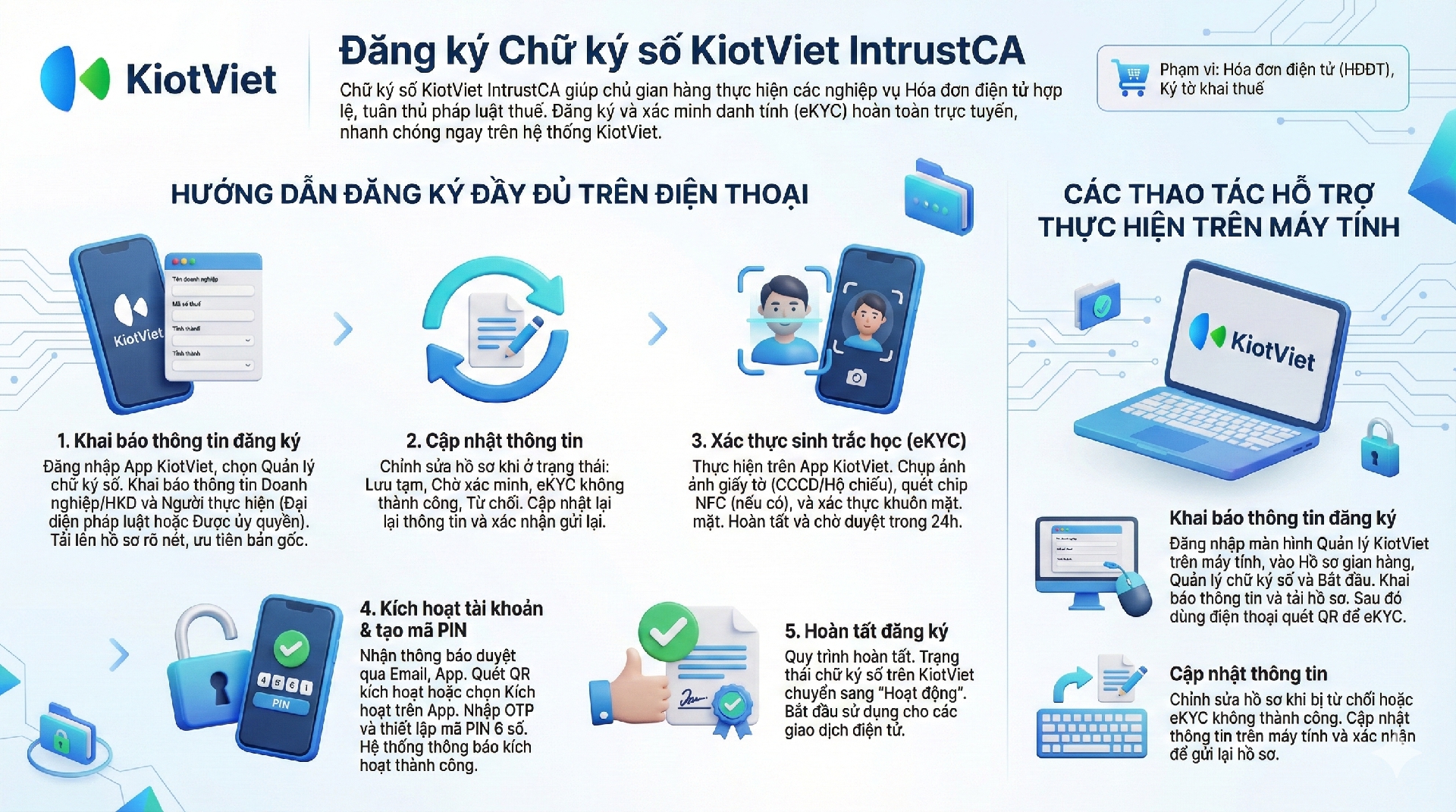 Để đồng hành và hỗ trợ người dùng tuân thủ các quy định pháp luật về thuế, đặc biệt là việc sử dụng Hóa đơn điện tử, KiotViet đã ra mắt tính năng đăng ký Chữ ký số từ xa (RMS) KiotViet IntrustCA trực tuyến. Tính năng này cho phép chủ gian hàng đăng ký và xác minh danh tính (eKYC) ngay trên hệ thống của KiotViet, giúp rút ngắn thời gian và đơn giản hóa quy trình cấp phát chữ ký số.