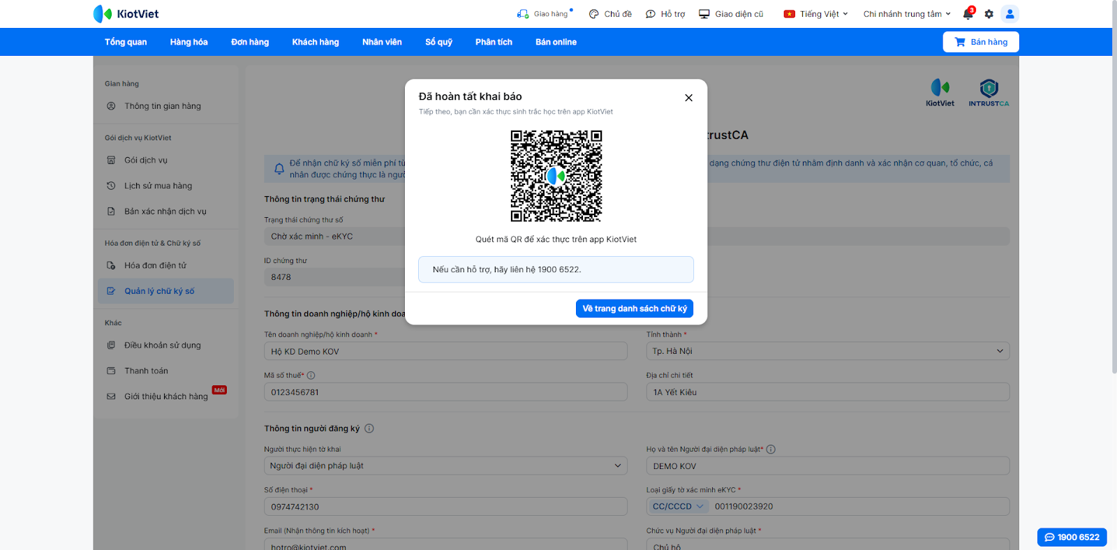 Sau khi khai báo, bạn cần thực hiện xác thực định danh ngay trên ứng dụng KiotViet.