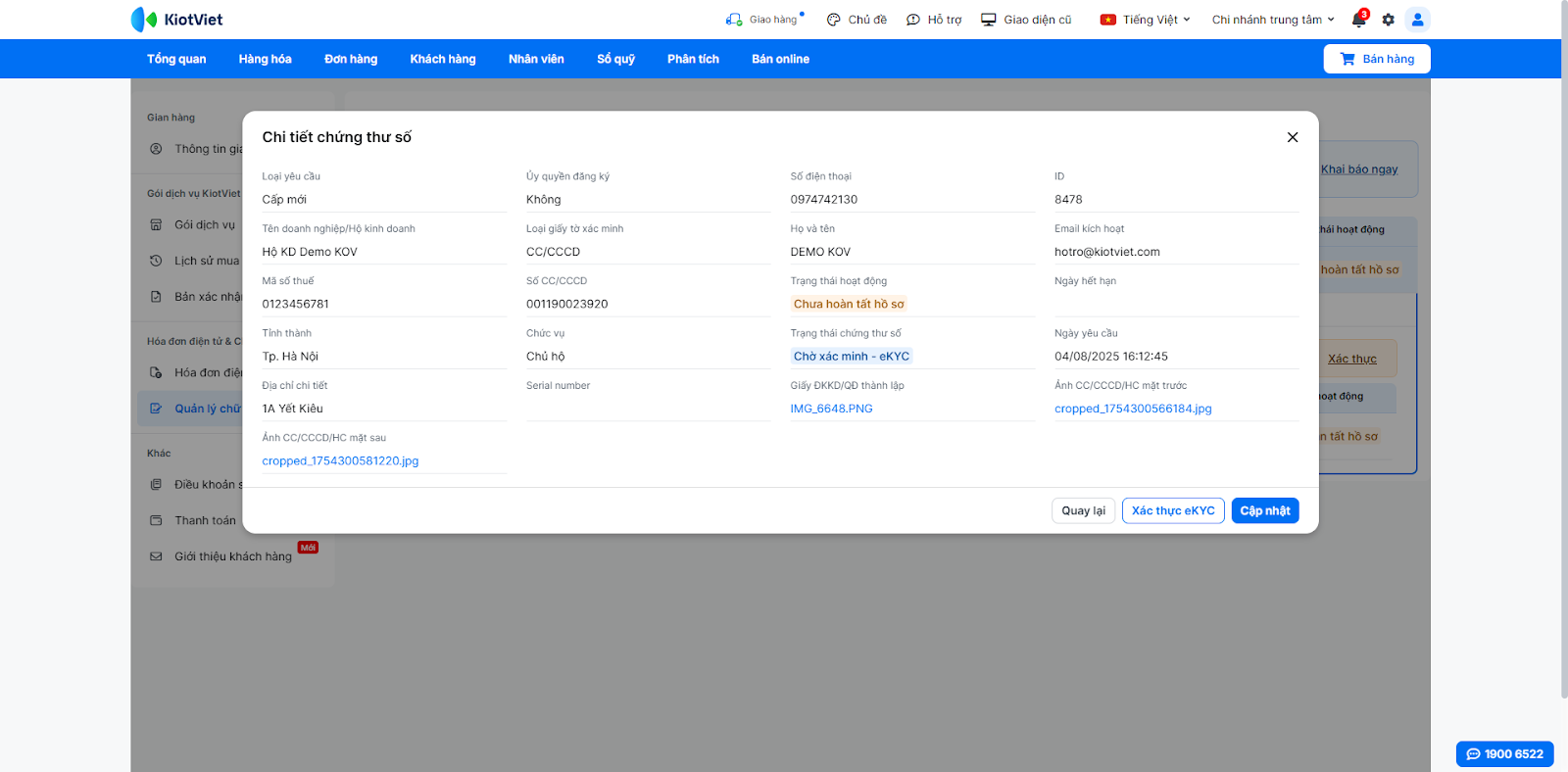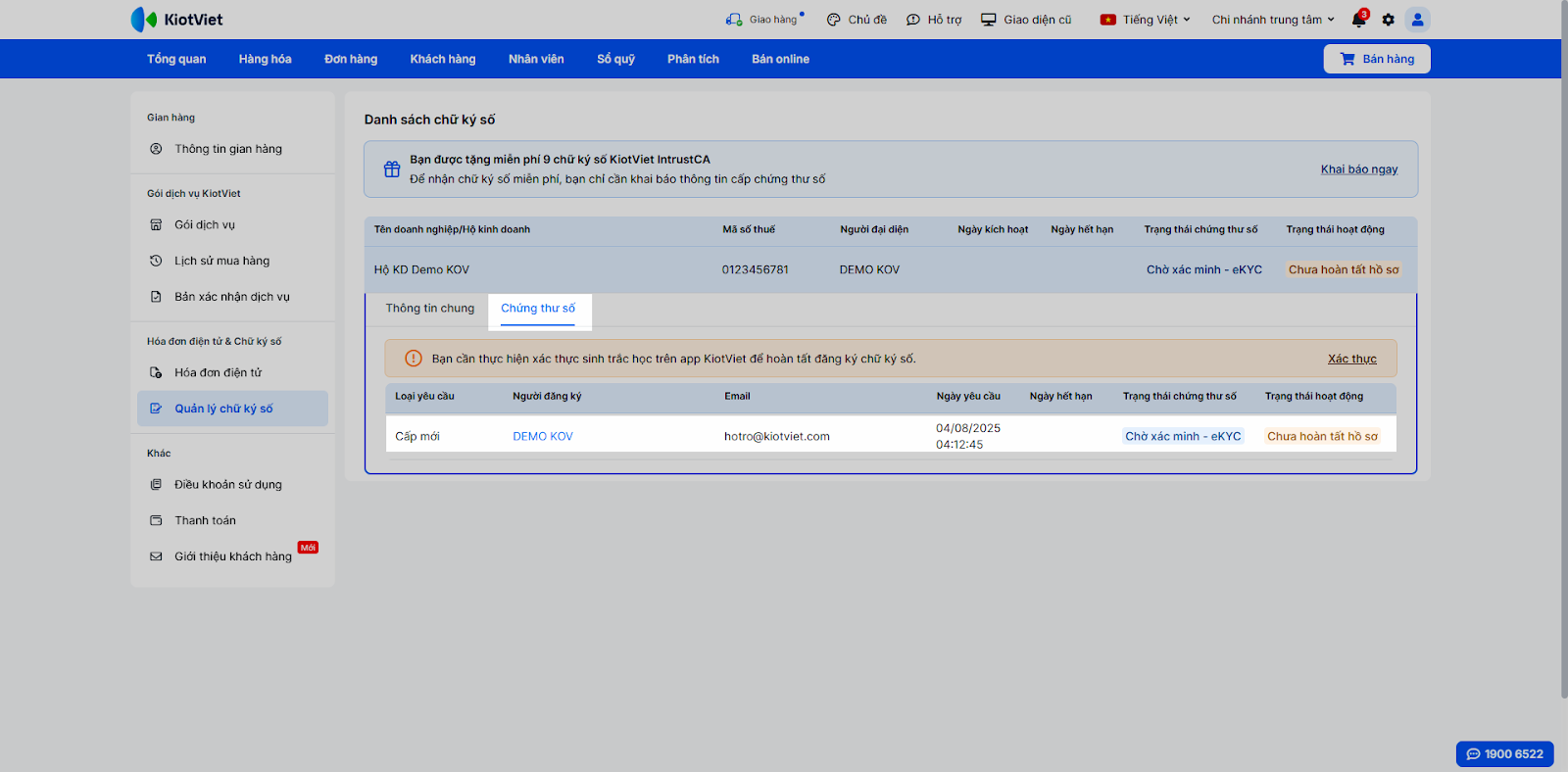 - Trạng thái chữ ký số trên KiotViet sẽ được cập nhật thành Hoạt động.