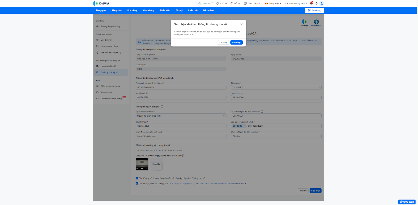 - Nhấn Cập nhật → chọn Xác nhận để gửi hồ sơ đến nhà cung cấp chữ ký số và nhận mã QR mới để xác thực lại.