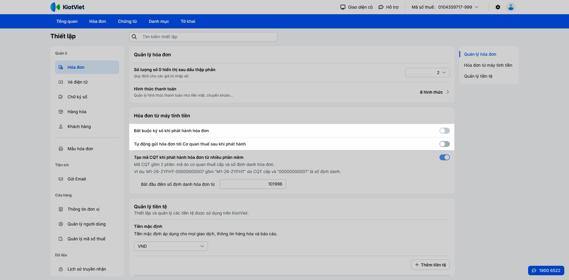 Nội dung phần này hướng dẫn các thao tác thiết lập có thể thực hiện trên giao diện máy tính (Web) và thao tác Thiết lập Chữ ký số lên phần mềm Hóa đơn điện tử KiotViet (KV-EINVOICE) (bắt buộc thiết lập trên máy tính).