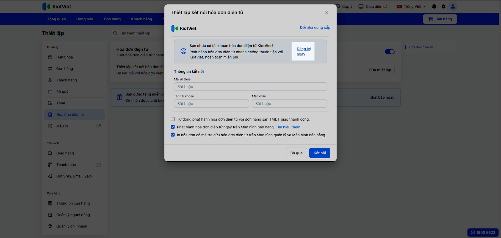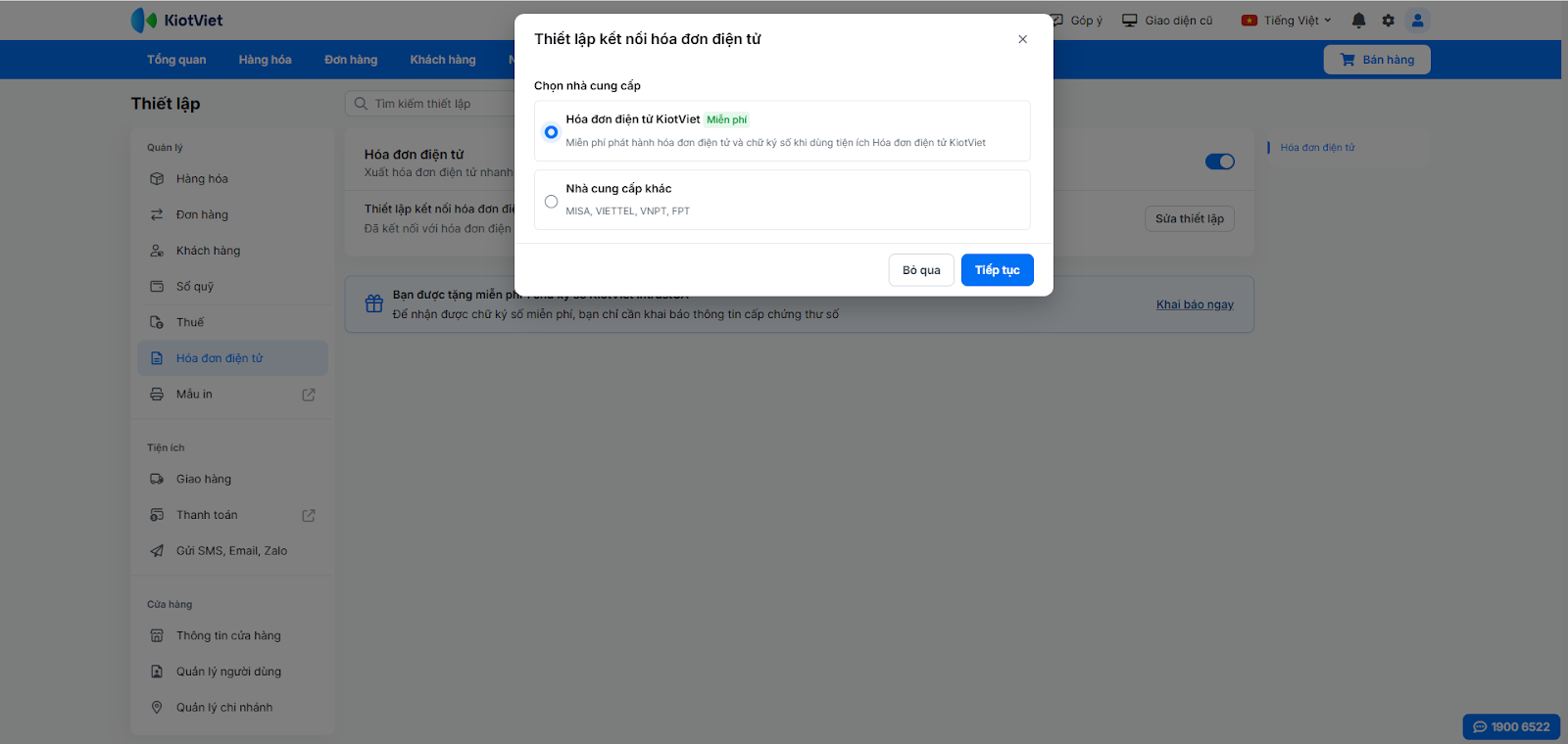- Hoặc tại pop-up Thiết lập kết nối hóa đơn điện tử, bạn chọn Hóa đơn điện tử KiotViet và nhấn Tiếp tục → chọn Đăng ký ngay.