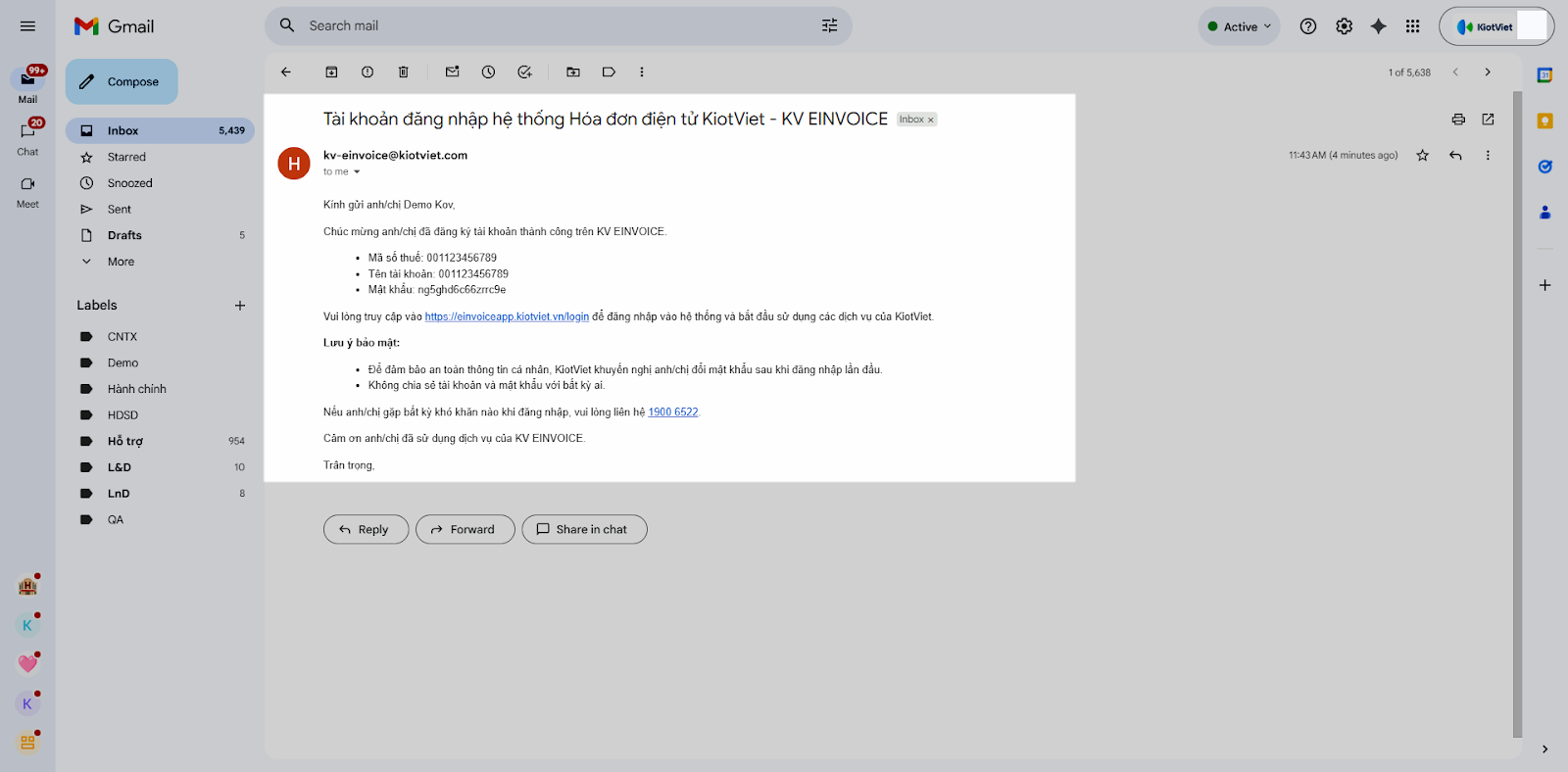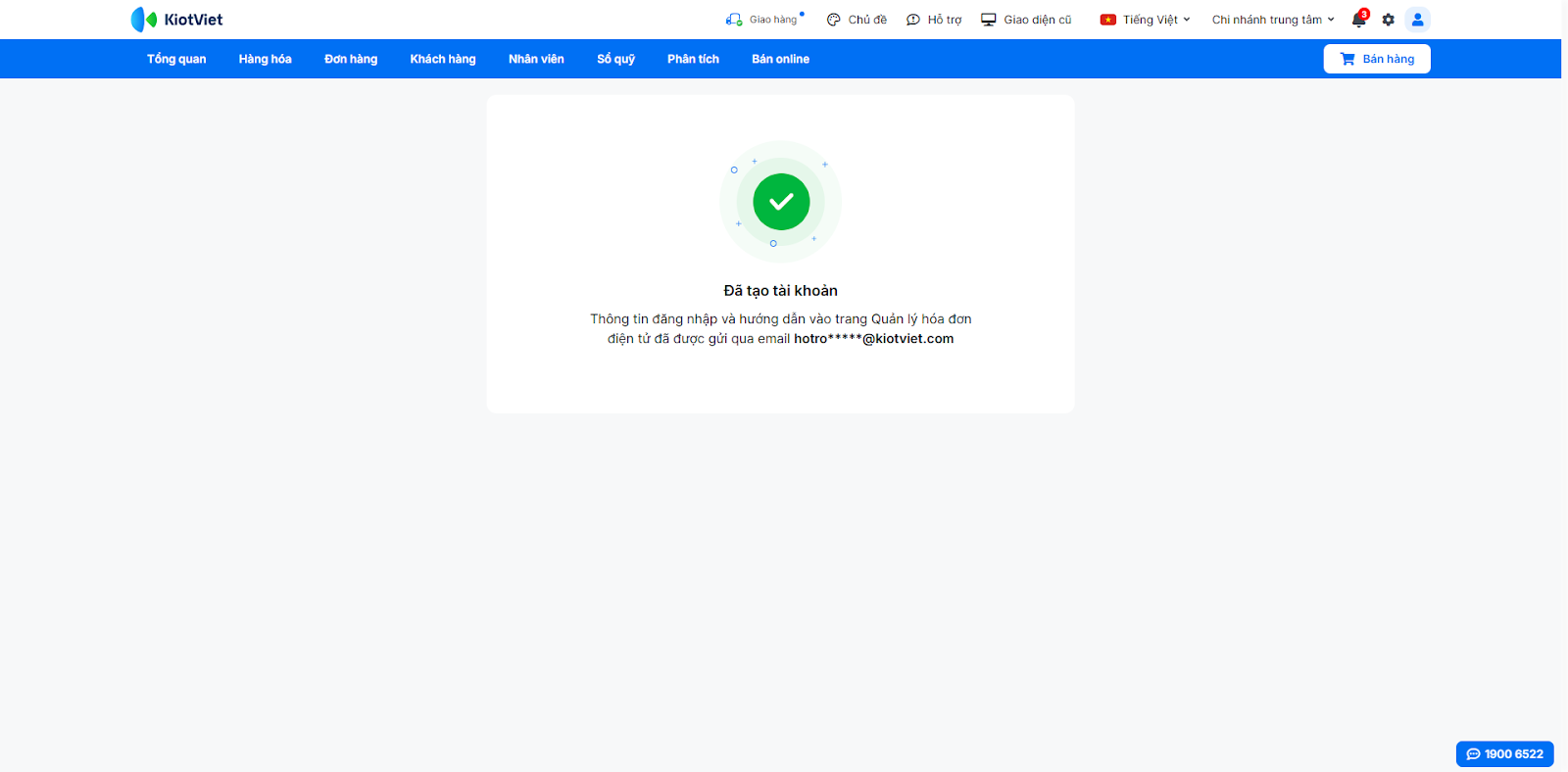 - Bạn kiểm tra email đã đăng ký để nhận thông tin đăng nhập vào phần mềm KiotViet Hóa đơn điện tử (KV-EINVOICE) và bắt đầu thực hiện các thiết lập tiếp theo như tạo mẫu hóa đơn, lập tờ khai…
