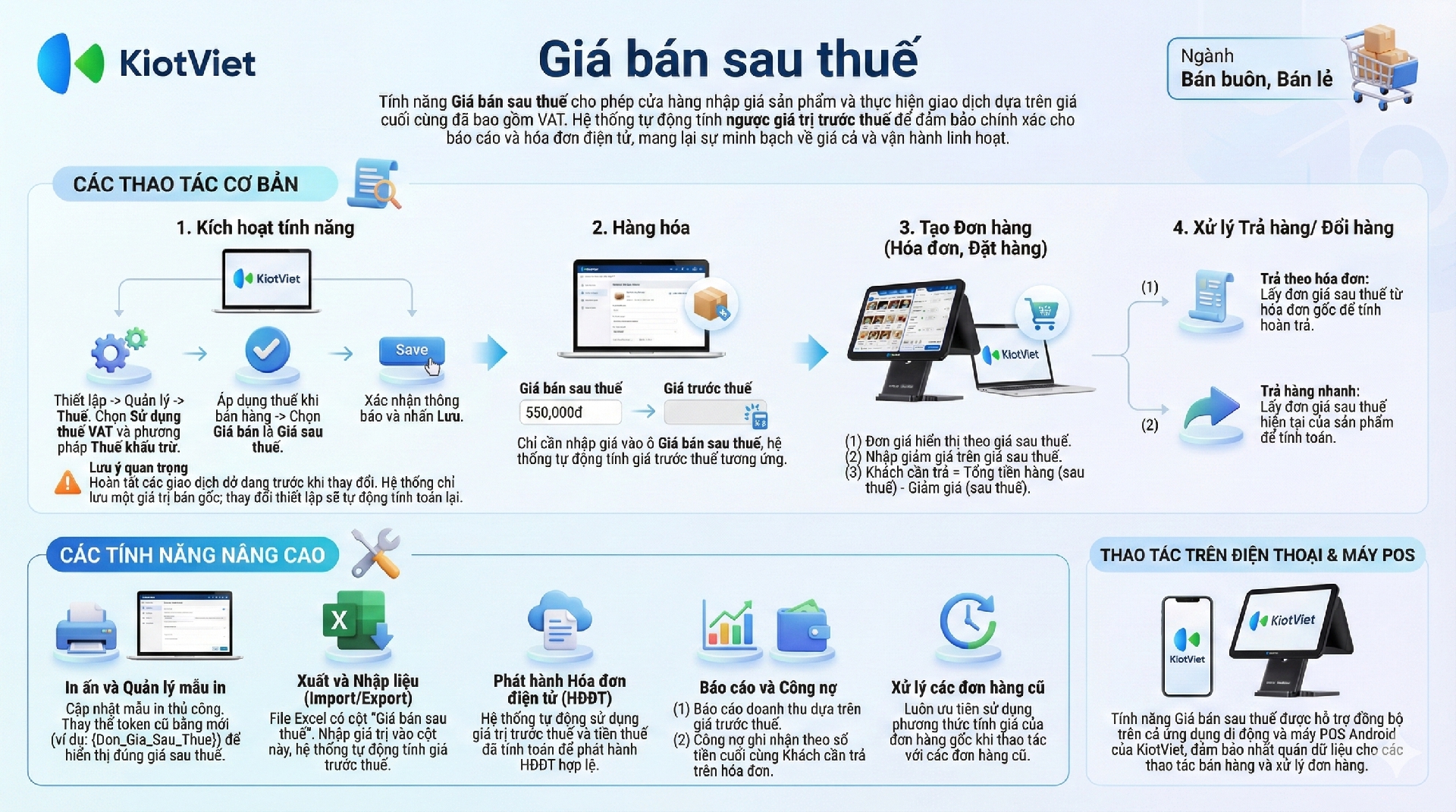 Tính năng Giá bán sau thuế cho phép cửa hàng (đặc biệt là mô hình bán lẻ B2C) nhập giá sản phẩm và thực hiện giao dịch dựa trên giá cuối cùng đã bao gồm VAT. Hệ thống sẽ tự động tính ngược giá trị trước thuế để đảm bảo chính xác khi lập báo cáo và xuất hóa đơn điện tử.