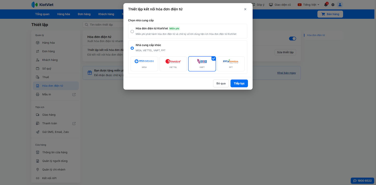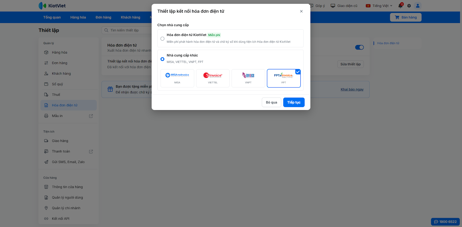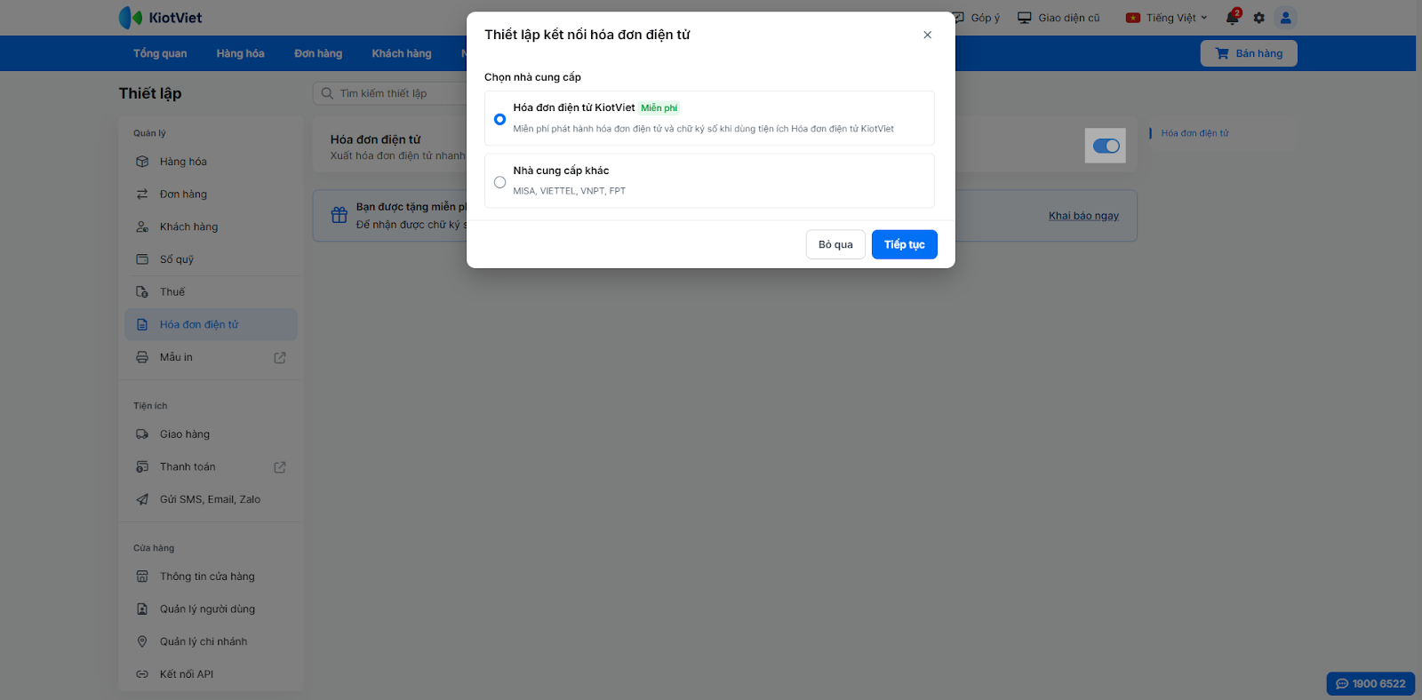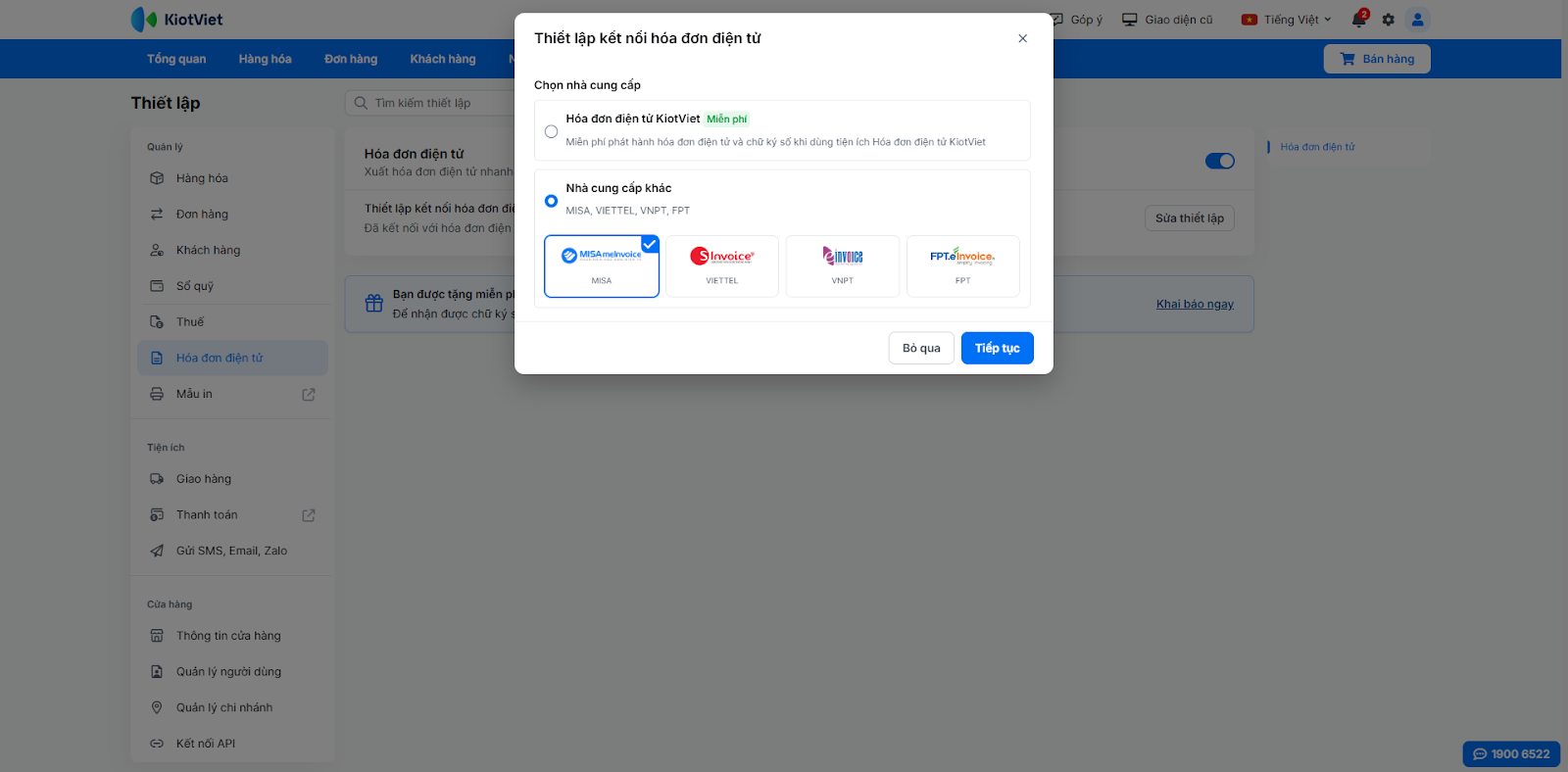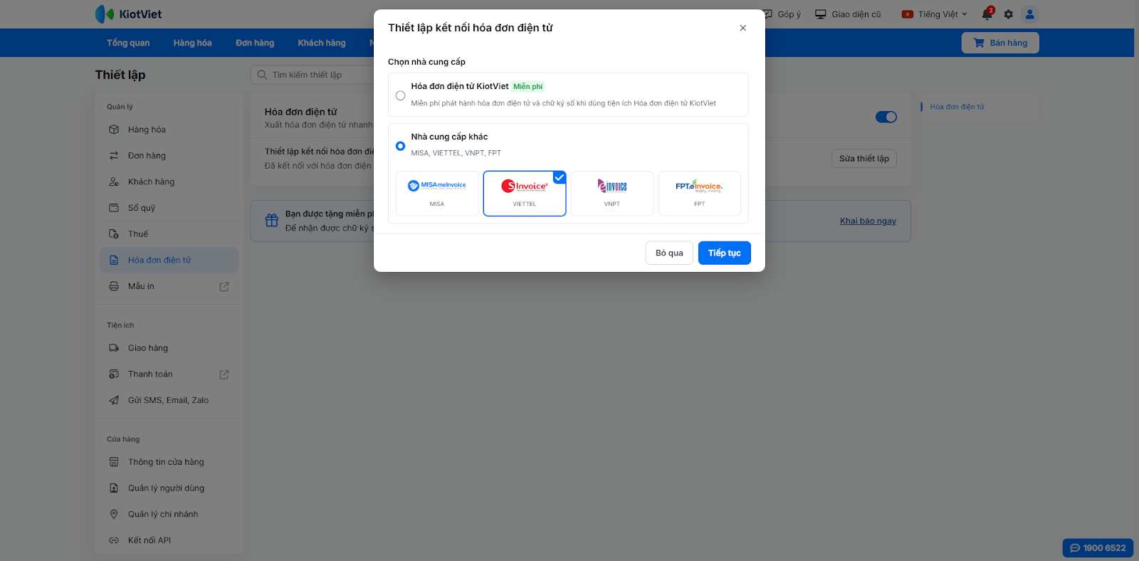 - Chọn nhà cung cấp là Hóa đơn điện tử KiotViet và nhấn Tiếp tục.
