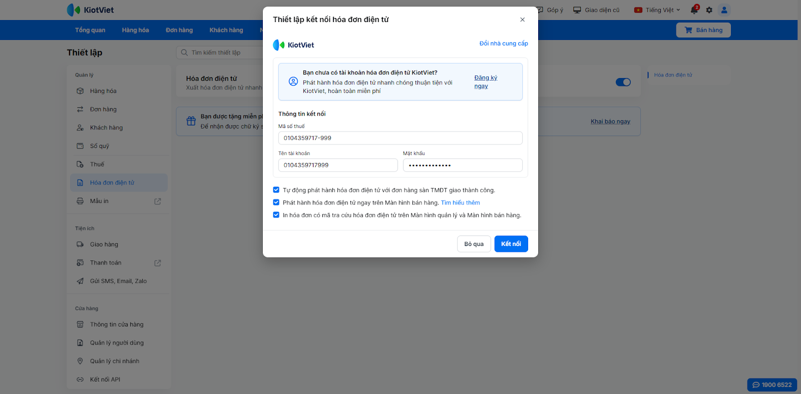 - Tình huống: Cửa hàng của bạn đã đăng ký và có tài khoản KiotViet eInvoice. Bây giờ, bạn cần kết nối tài khoản này vào phần mềm quản lý bán hàng KiotViet.