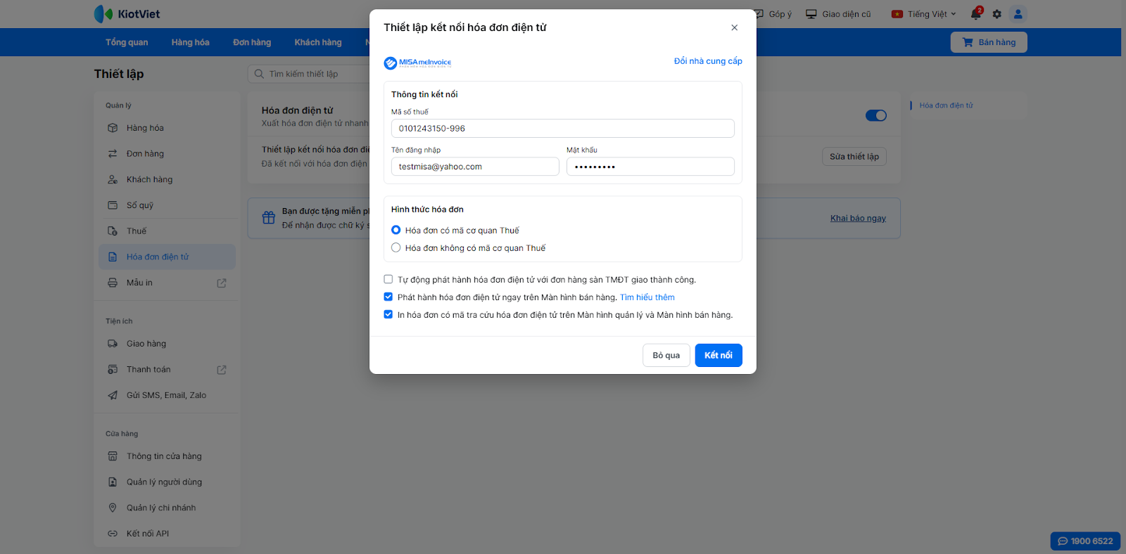 - MISA meInvoice: Tại pop-up Thiết lập kết nối hóa đơn điện tử, chọn MISA, nhập thông tin tài khoản MISA meInvoice của bạn và chọn mẫu hóa đơn điện tử muốn sử dụng.