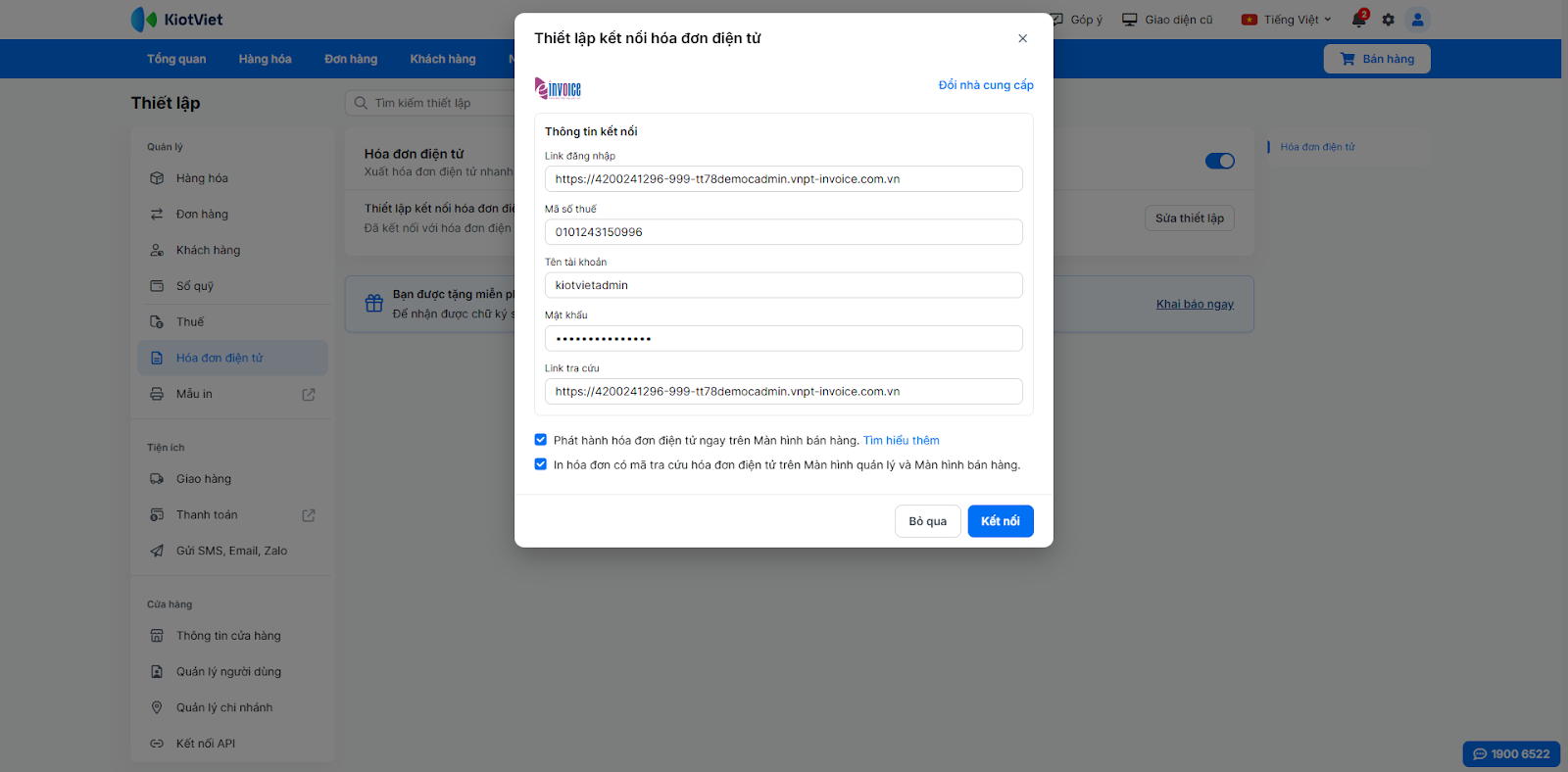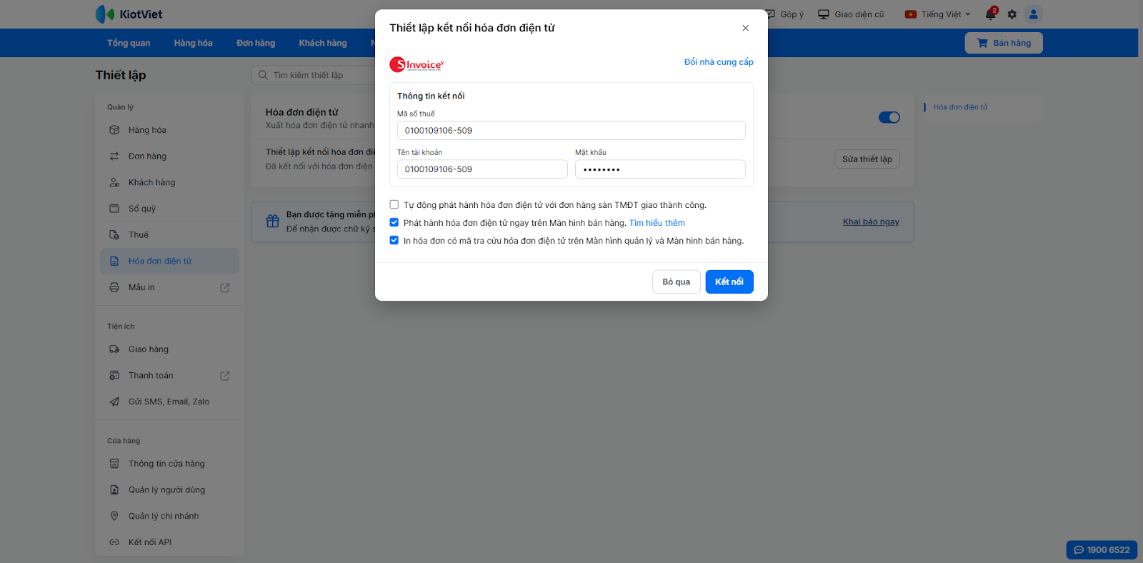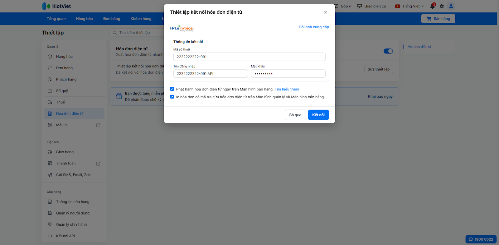Bên cạnh KiotViet eInvoice, bạn cũng có thể kết nối với các nhà cung cấp HĐĐT khác. Quy trình kết nối chung là vào pop-up Thiết lập kết nối hóa đơn điện tử, chọn nhà cung cấp và điền thông tin tài khoản tương ứng.