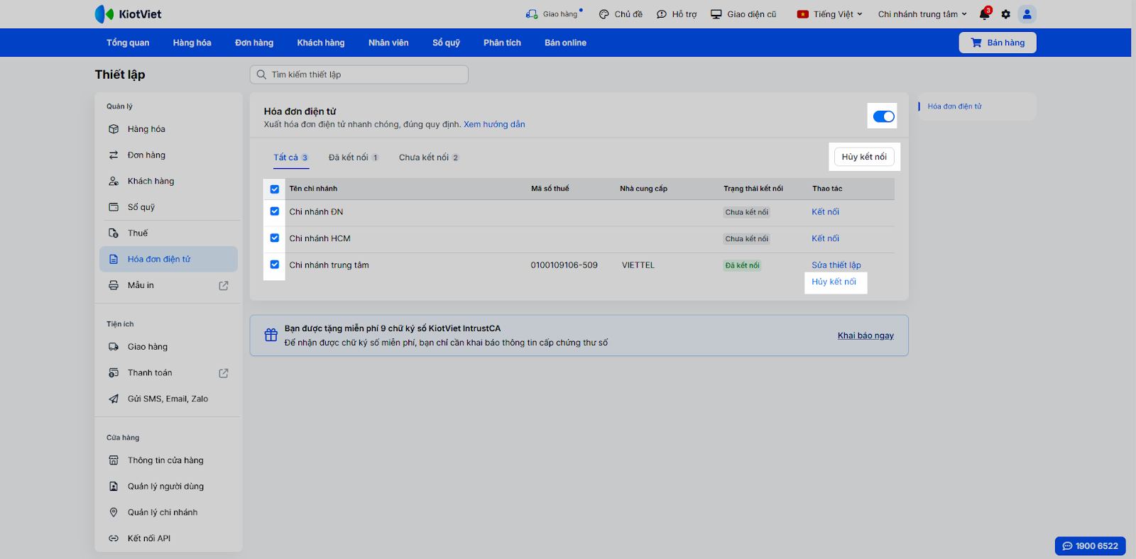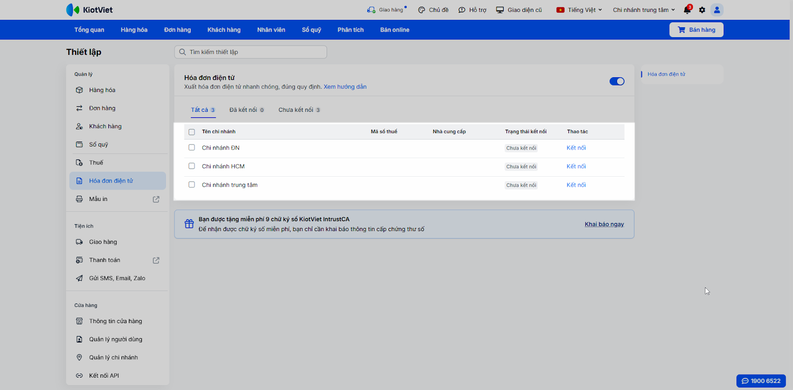 - Thiết lập: Sau khi bật tính năng Hóa đơn điện tử, hệ thống sẽ hiển thị danh sách các chi nhánh. Bạn có thể kết nối mỗi chi nhánh với một nhà cung cấp hóa đơn điện tử.