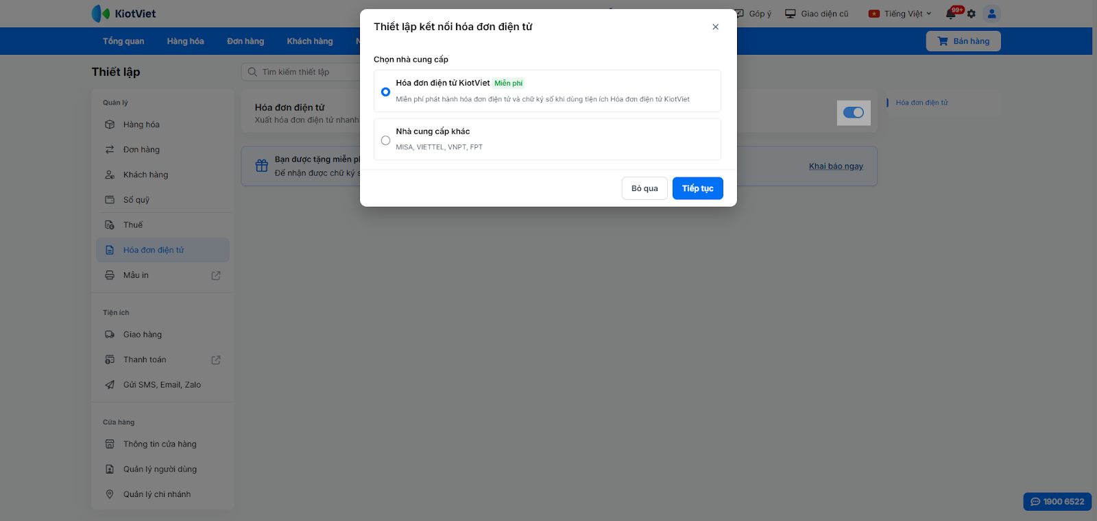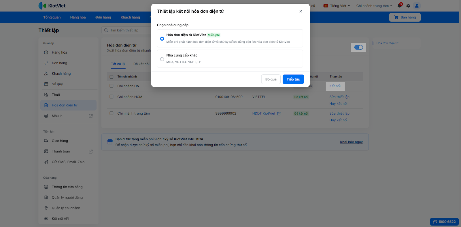 - Với gian hàng có 1 chi nhánh → bạn chọn nhà cung cấp Hóa đơn điện tử KiotViet và nhấn Tiếp tục.